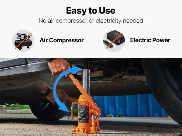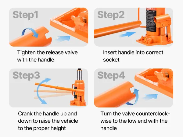 Effortless Operation: No need to strain with this bottle jack—use the 2-piece handle and sliding pump to lift your load. Ready to lower? Turn the valve slowly counterclockwise for safe descent. Always use jack stands to hold the weight after lifting