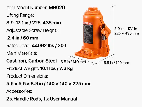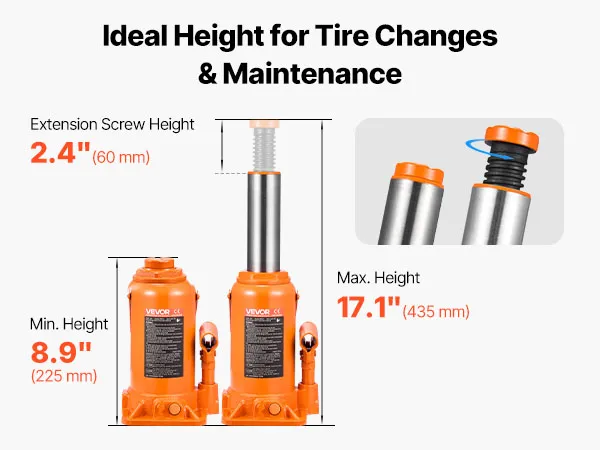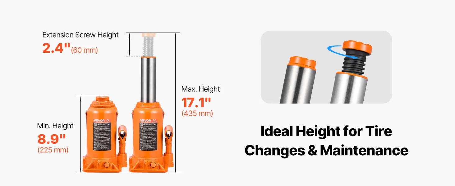 Wide Lifting Range: From low to high, this high lift bottle jack's got the range. It lifts from 8.9 in (225 mm) up to 17.1 in (435 mm), with a 2.4 in (60 mm) screw for fine-tuning the height—handy when space is tight
