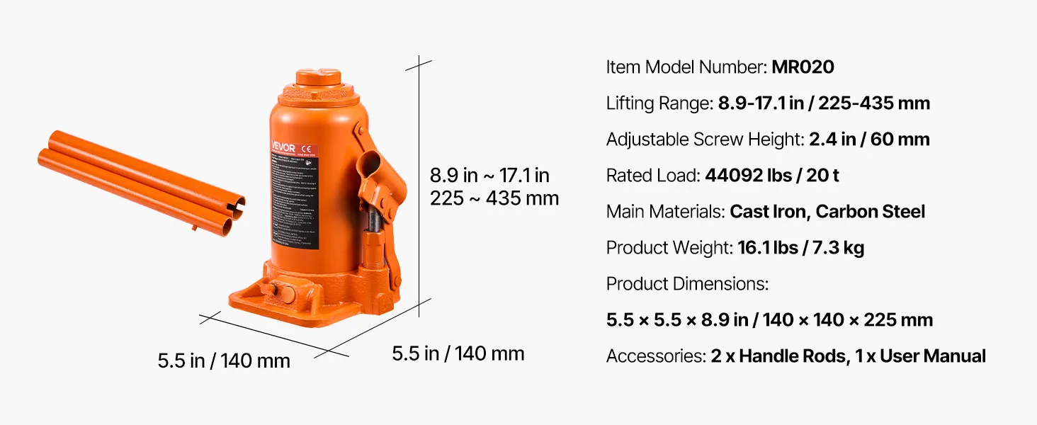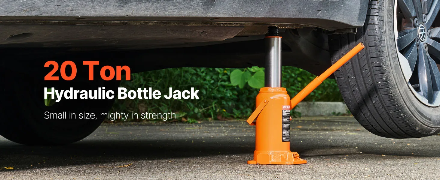 This hydraulic bottle jack uses manual pumping to lift up to 20 tons (44,092 lbs) with steady force—no electricity or air needed. It's a solid pick for heavy-duty jobs around the home, garage, or driveway.