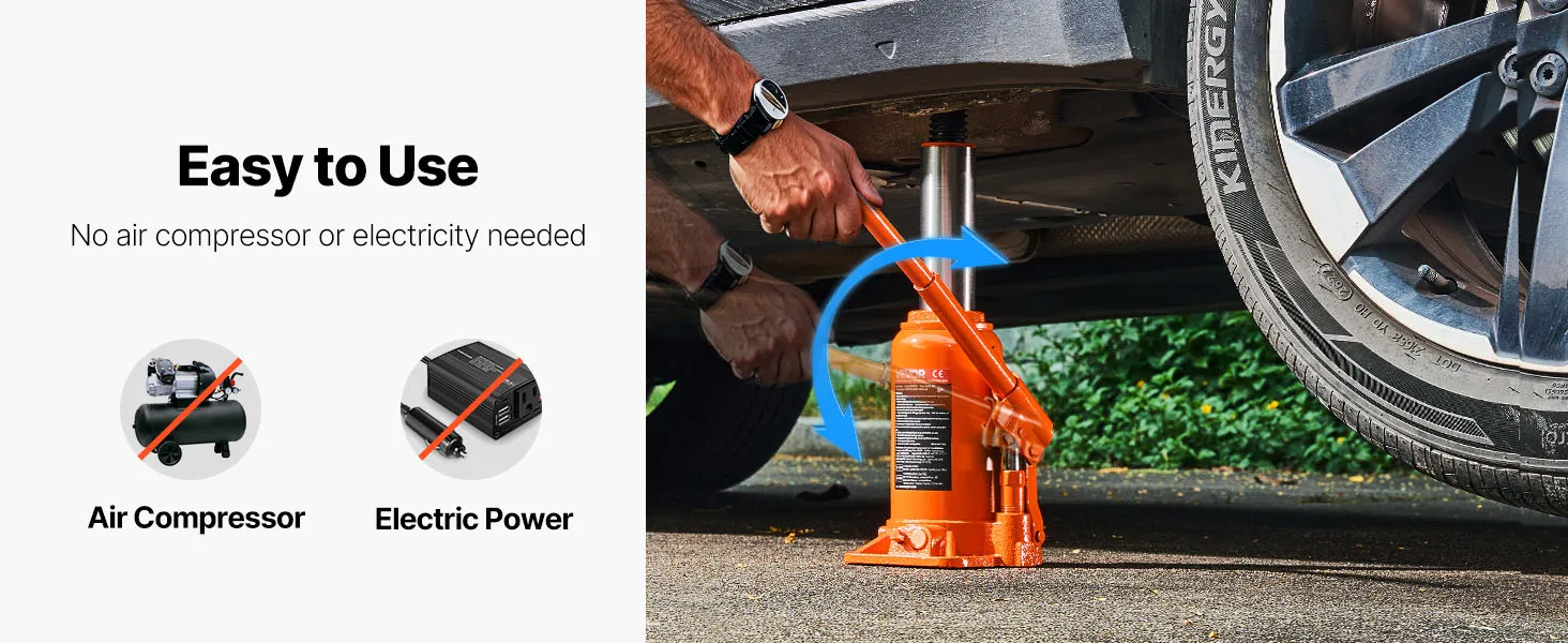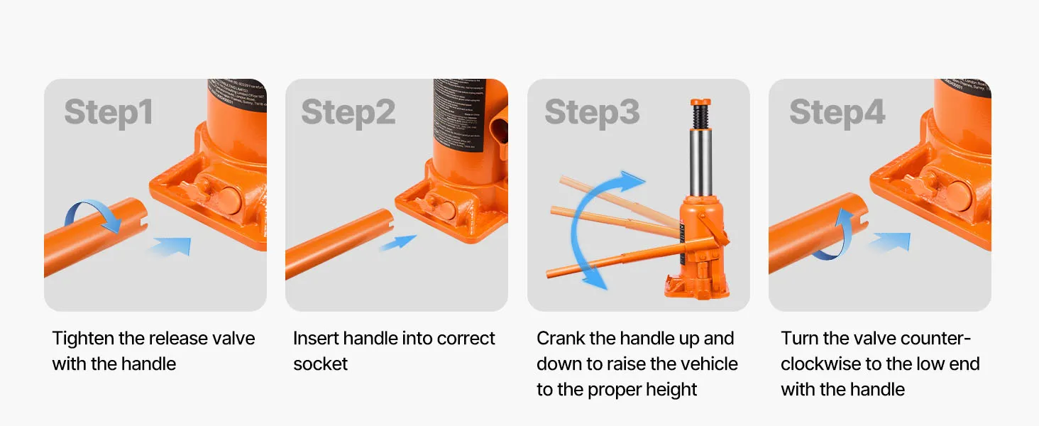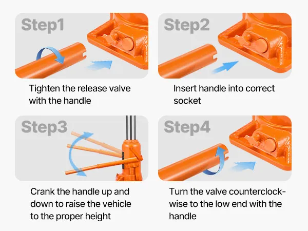 Effortless Operation: No need to strain with this bottle jack—use the 2-piece handle and sliding pump to lift your load. Ready to lower? Turn the valve slowly counterclockwise for safe descent. Always use jack stands to hold the weight after lifting