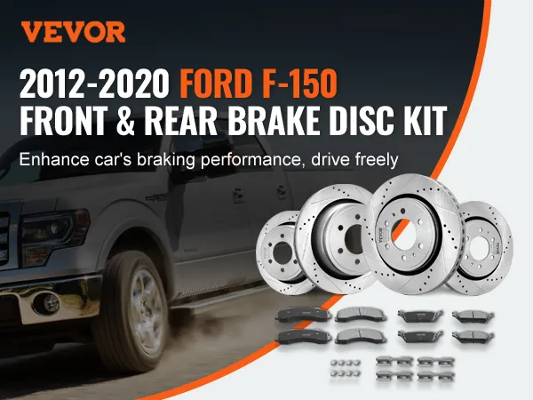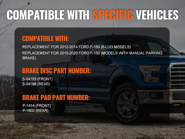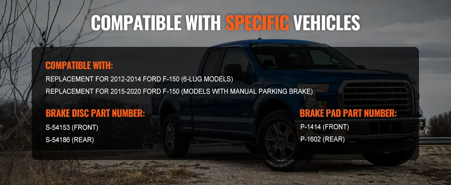 The kit is specifically designed for 2012-2020 ford F-150 brake rotors models. It includes 2 front rotors, 2 rear rotors, 4 front brake pads, and 4 rear brake pads. This makes it an all-inclusive solution for ford F-150 owners. The kit is compatible with both 6-lug models as well as those with manual parking brakes, ensuring it fits exactly with the vehicle you are driving. That's why the compatibility feature saves you from the struggle of finding separate components. Furthermore, it ensures optimal performance and safety for your Ford F-150.
