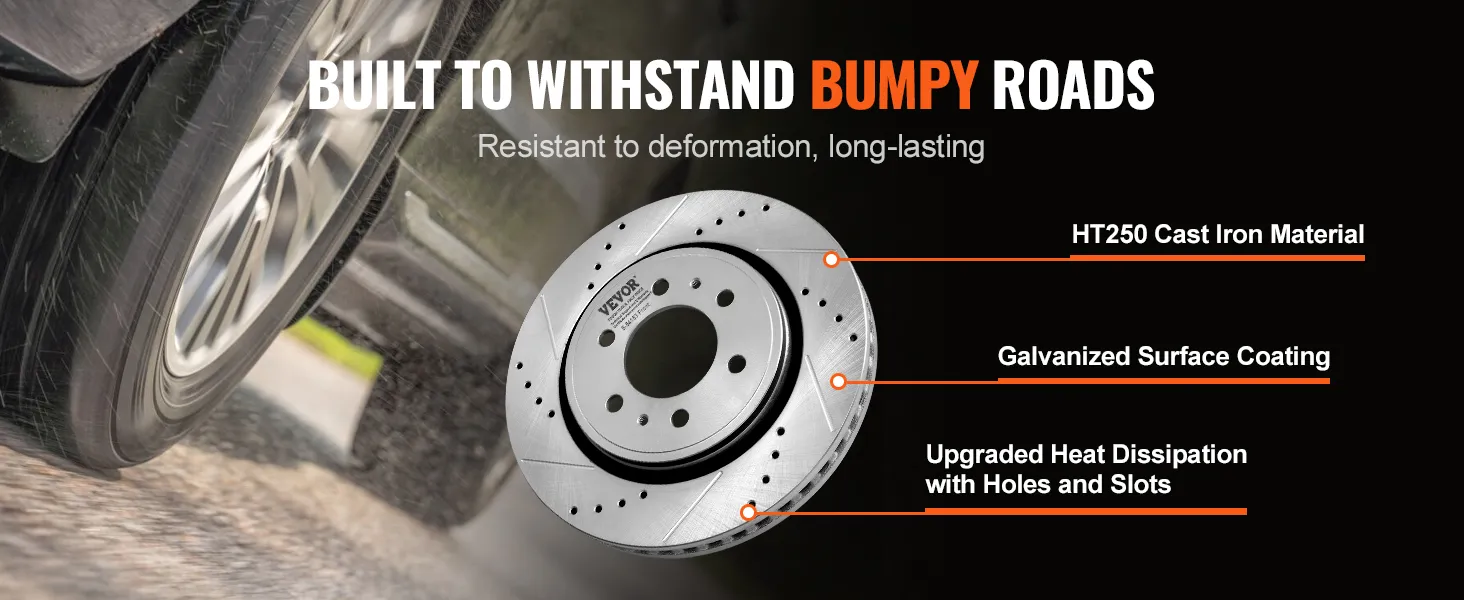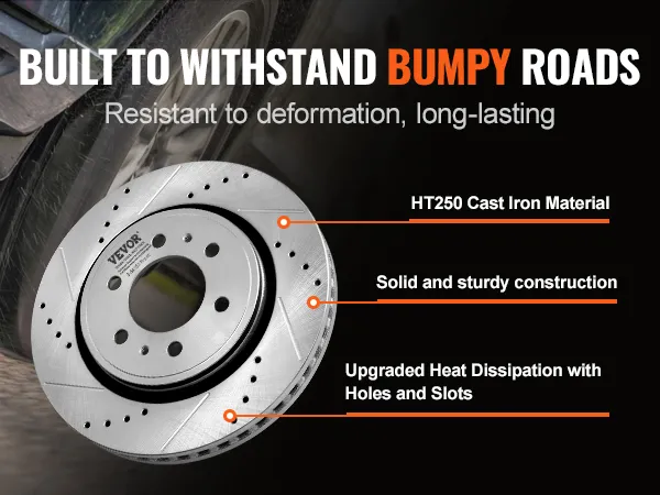 It is important for ford F-150 brake pads kit owners who regularly tow or carry heavy loads. The drilled and slotted design prevents water and dust accumulation. This keeps the braking system clean and functional in various environments. These rotors are made from HT250 cast iron. They ensure durability and resistance to deformation. So, you get consistent brake performance over time.
