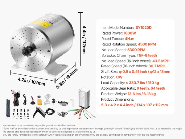 Easy DIY Installation: Package includes: 1 x 48V 1800W Brushless Motor, 1 x Motor Controller, 1 x Foot Pedal Throttle, 1 x Twistgrip Throttle, and 1 x Set of Assembly Hardware. This motor kit comes with detailed wiring diagram instruction, ideal for DIY enthusiasts and hobbyists looking to upgrade or build custom electric vehicles.