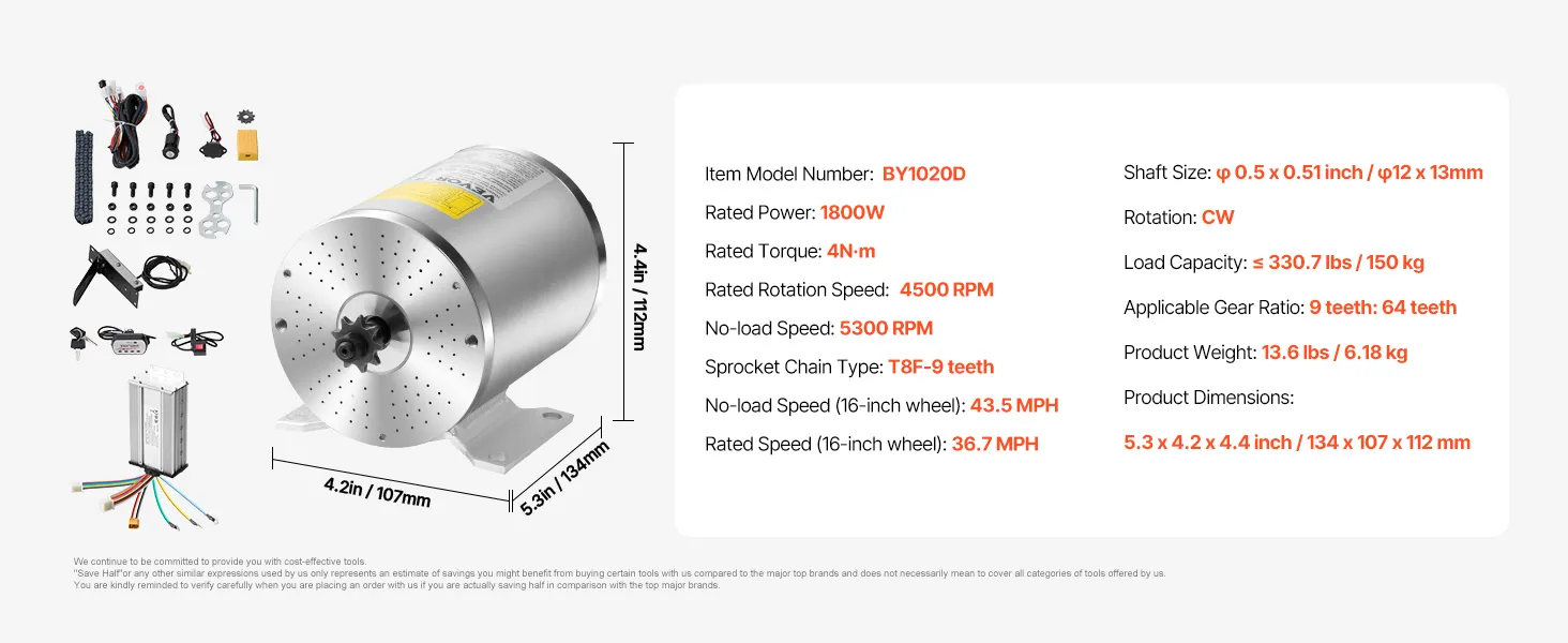 High-Power, Efficient Performance: VEVOR brushless DC motor delivers 1800W of output power and operates efficiently with 85% conversion efficiency, ensuring reliable speed even on challenging terrains and less energy consumption. Perfect for electric bikes, scooters, and other DIY electric vehicle projects that require high performance.