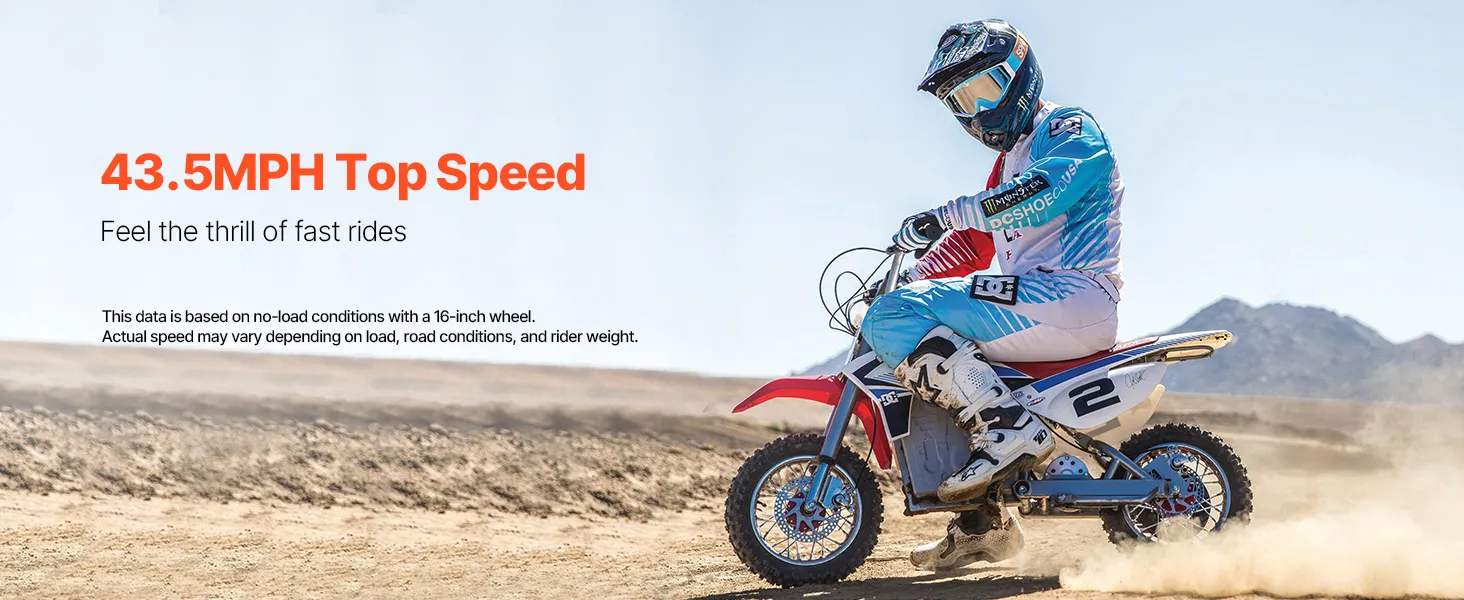 Experience the ultimate thrill with 43.5 MPH no-load speed! Feel the exhilaration of fast rides that make every journey unforgettable. (This top speed is based on no-load conditions with a 16-inch wheel — actual speed may vary depending on load, road conditions, and rider weight)