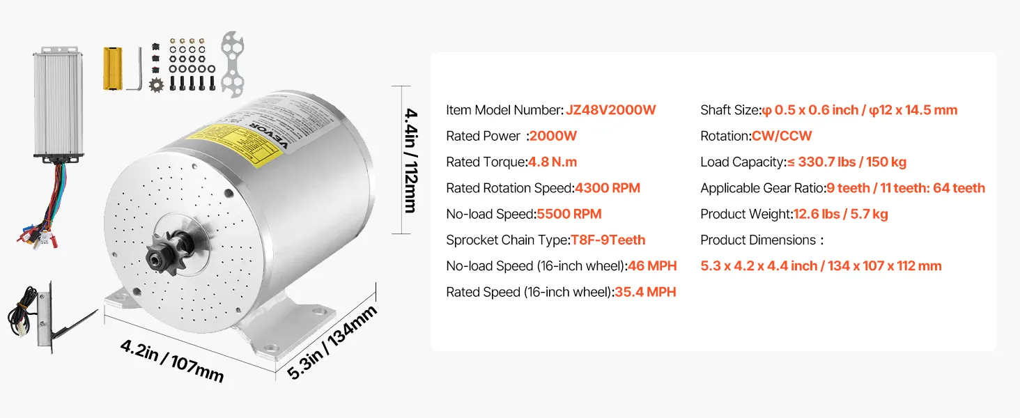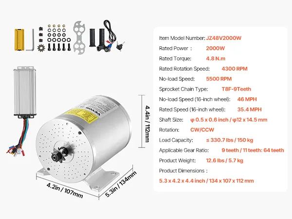 Easy DIY Installation: Package includes: 1 x 48V 2000W Brushless Motor, 1 x Motor Controller, 1 x Twistgrip Throttle, 1 x 3-Speed Switch, 1 x Set of Assembly Hardware, and 1 x User Manual. This motor kit comes with detailed wiring diagram instruction, ideal for DIY enthusiasts and hobbyists looking to upgrade or build custom electric vehicles.