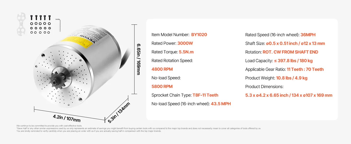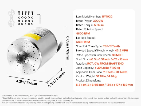 High-Power, Efficient Performance: VEVOR brushless DC motor delivers 3000W of output power and operates efficiently with 85% conversion efficiency, ensuring reliable speed even on challenging terrains and less energy consumption. Perfect for electric bikes, scooters, and other DIY electric vehicle projects that require high performance.