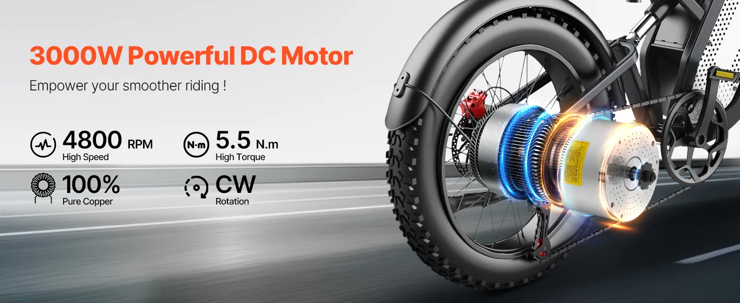 Experience the ultimate thrill with 43.5 MPH no-load speed! Feel the exhilaration of fast rides that make every journey unforgettable. (This top speed is based on no-load conditions with a 16-inch wheel — actual speed may vary depending on load, road conditions, and rider weight)