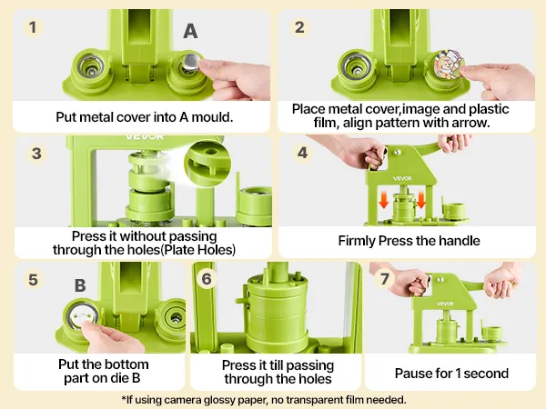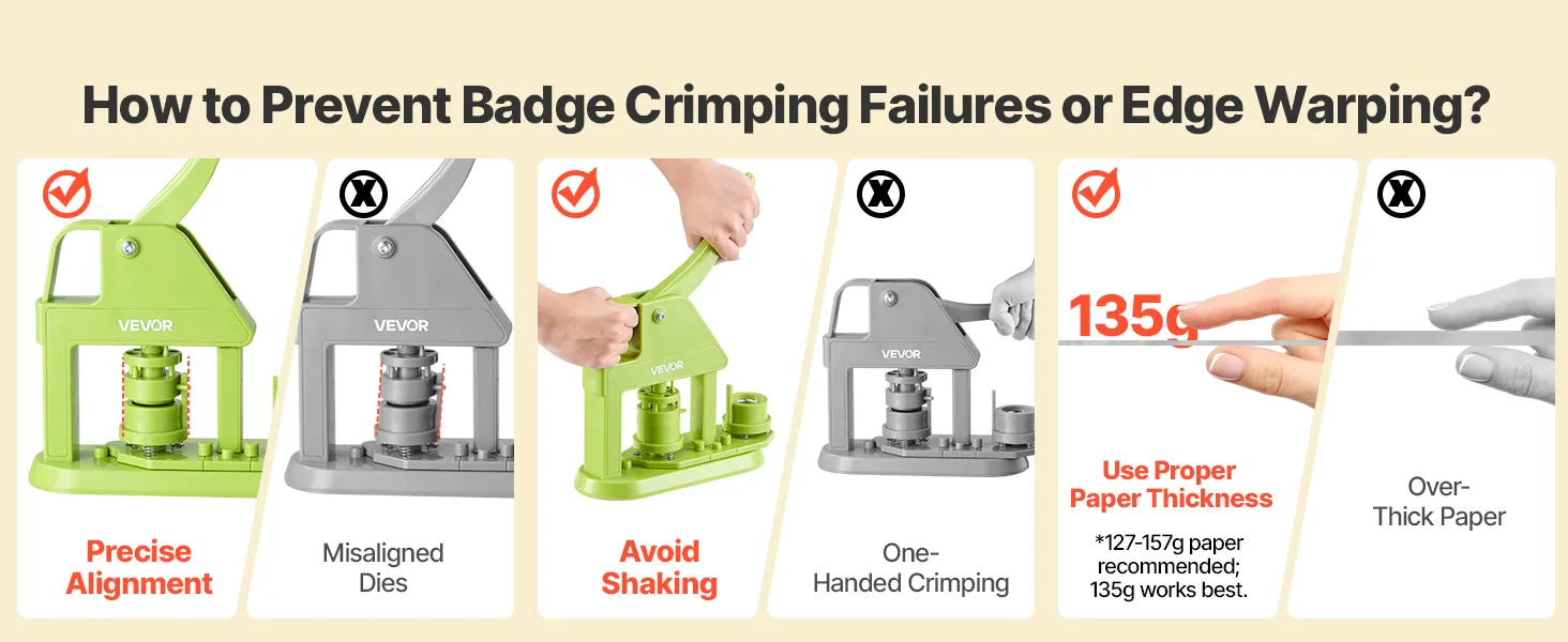 High Success Rate: Precision molds and alignment guides help avoid tilted designs, ensuring ideal outcomes every time. It is recommended to use 127-157g paper (135g performs especially well). Avoid mold shifting while using the button maker machine