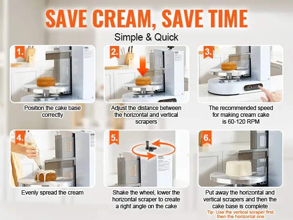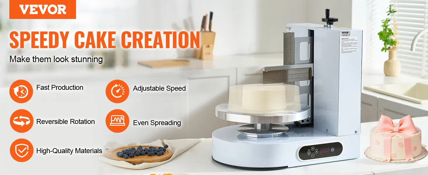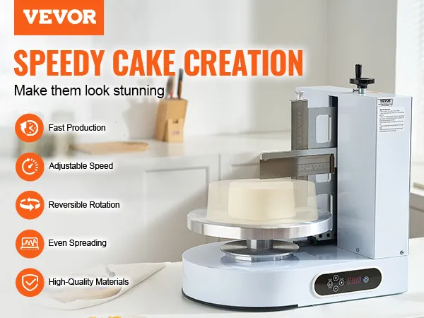 Simple Operation: Cake frosting machine is ready to use, with one-click start and stop. The speed of turntable is adjustable from 25 to 320 RPM (in increments of 5) and it can rotate both clockwise and counterclockwise. The one-handed control scraper, freely adjustable in height, is highly operable, enabling even beginners to master it quickly!