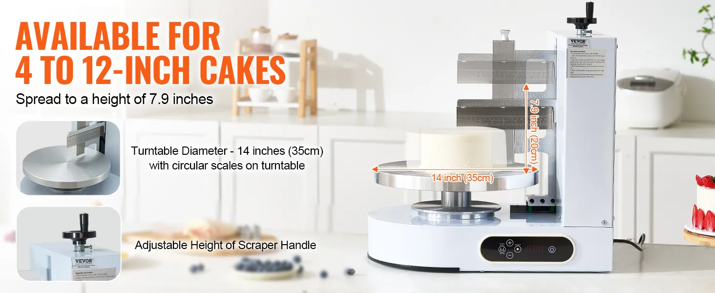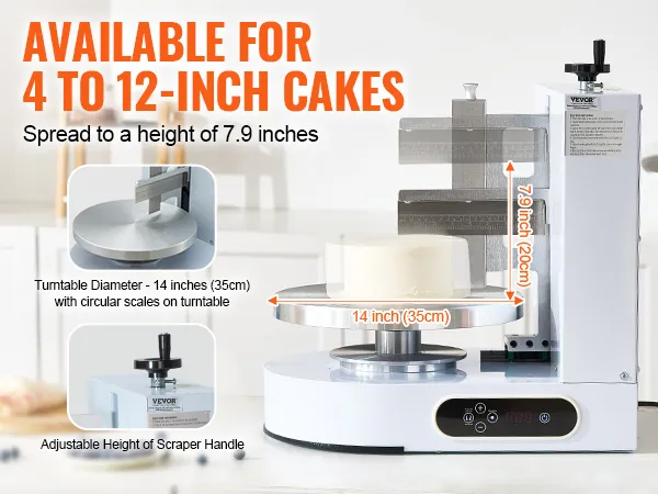 Quickly Decorating: Our cake decorating machine is suitable for cakes size 4 to 12 inches, and can spread up to 7.9 inches in height. Its 14" (35 cm) turntable with concentric circles offers ample space, so it's easy to pick up the cake, saving raw materials and enhancing work efficiency for baking artists.
