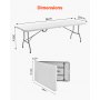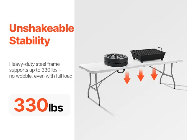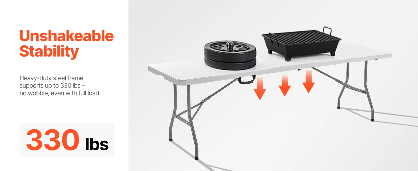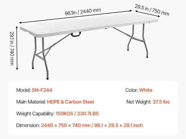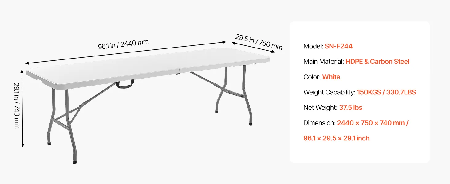 Q: What are the dimensions of the tabletop?A: The tabletop measures 8 feet (96 inches / 224 cm), providing ample space for meals, gear, or activities.Q: How much weight can the table support? Is it stable?A: The table supports up to 330 lbs (150 kg) and features a robust frame with legs that resist wobbling.Q: How much does the table weigh? Is it easy to move?A: The table is lightweight at 37.5 lbs/ 17 kg and folds compactly, making it effortless to carry with the built-in handle and store in car trunks or closets.Q: Is assembly required? How complicated is it?A: No tools are needed – simply follow the included installation manual for assembly. Setup is quick and intuitive for anyone.