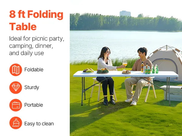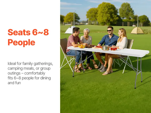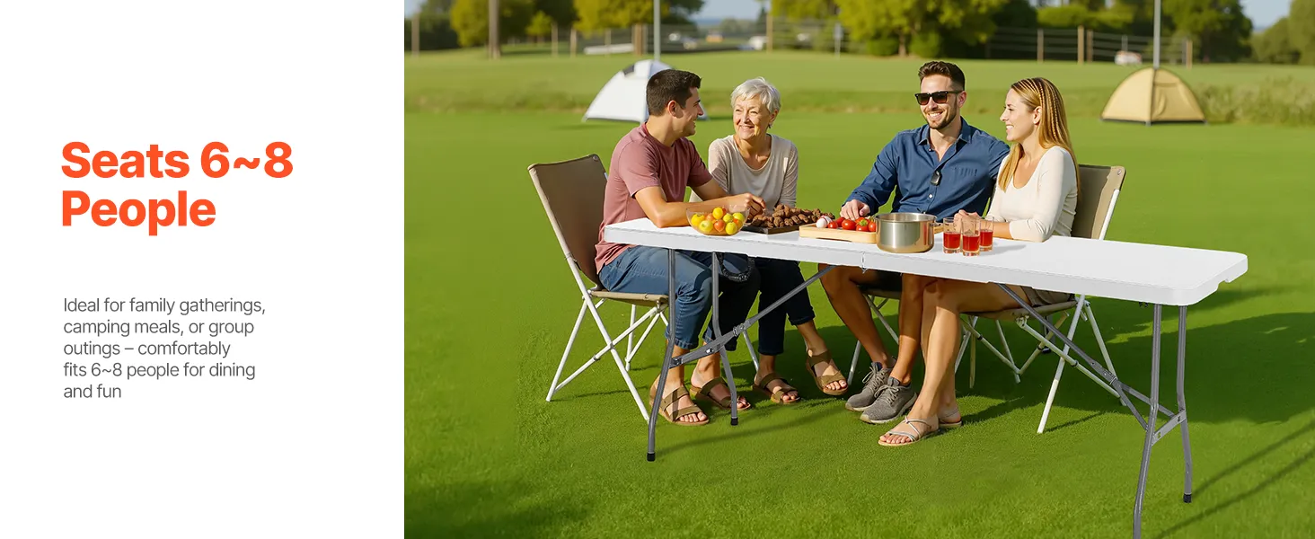 Spacious Multi-Person Design: The camping table has a 8ft wide tabletop seating 6-8 adults, ideal for camping, tailgates, or barbecues. Suitable for dining, work, or buffets—quick-lock mechanism ensures easy adjustments