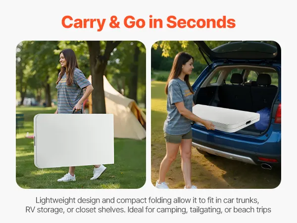 Easy Storage & Carry: The compact work table is lightweight, and folds to 48x29.5x3.5 in. Built-in handle and buckle enable one-handed carrying. Slim profile fits car trunks, RVs, or garages—no assembly, sets up in seconds