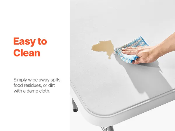 Rugged Surface & Stable Base: The waterproof, scratch-proof HDPE surface helps resist spills and abrasions. The locking legs with non-slip rubber caps help ensure stability on floor—minimizing wobbling during use