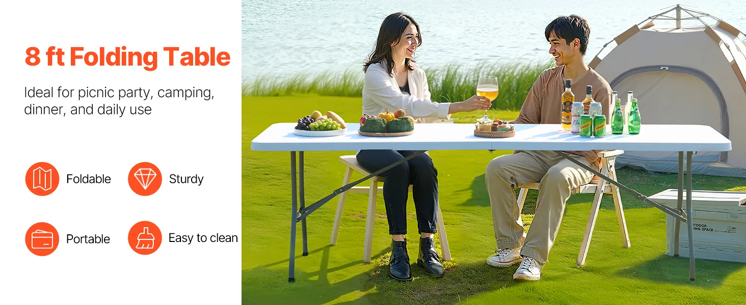 VEVOR Folding Table, 8 Ft Heavy Duty Portable Fold-in-Half Utility Table, Indoor Outdoor Plastic Rectangle Table with Built in Handle, for Party, Dining, Wedding, Events, Picnic, Camping, White