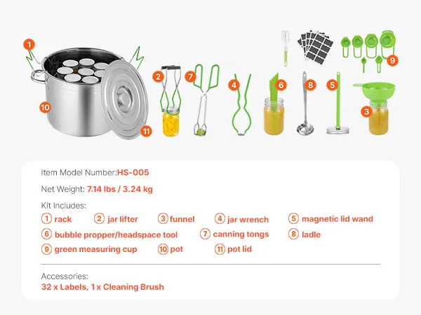 • Complete Kit: The 11-piece canning supplies starter kit provides all the essential tools for canning, including a rack, jar lifter, funnel, jar wrench, magnetic lid wand, bubble propper/headspace tool, canning tongs, ladle, green measuring cup, pot lid, pot. Plus, it also comes with labels and a cleaning brush, so everything you need is included in one package