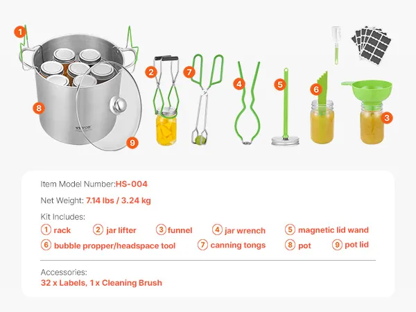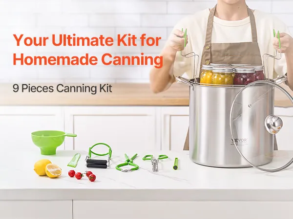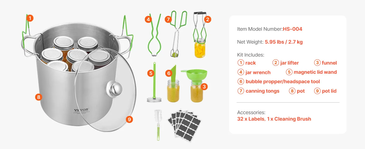 Complete Kit: The 9-piece canning supplies starter kit provides all the essential tools for canning, including a rack, jar lifter, funnel, jar wrench, magnetic lid wand, bubble propper/headspace tool, canning tongs, pot lid, pot. Plus, it also comes with labels and a cleaning brush, so everything you need is included in one package