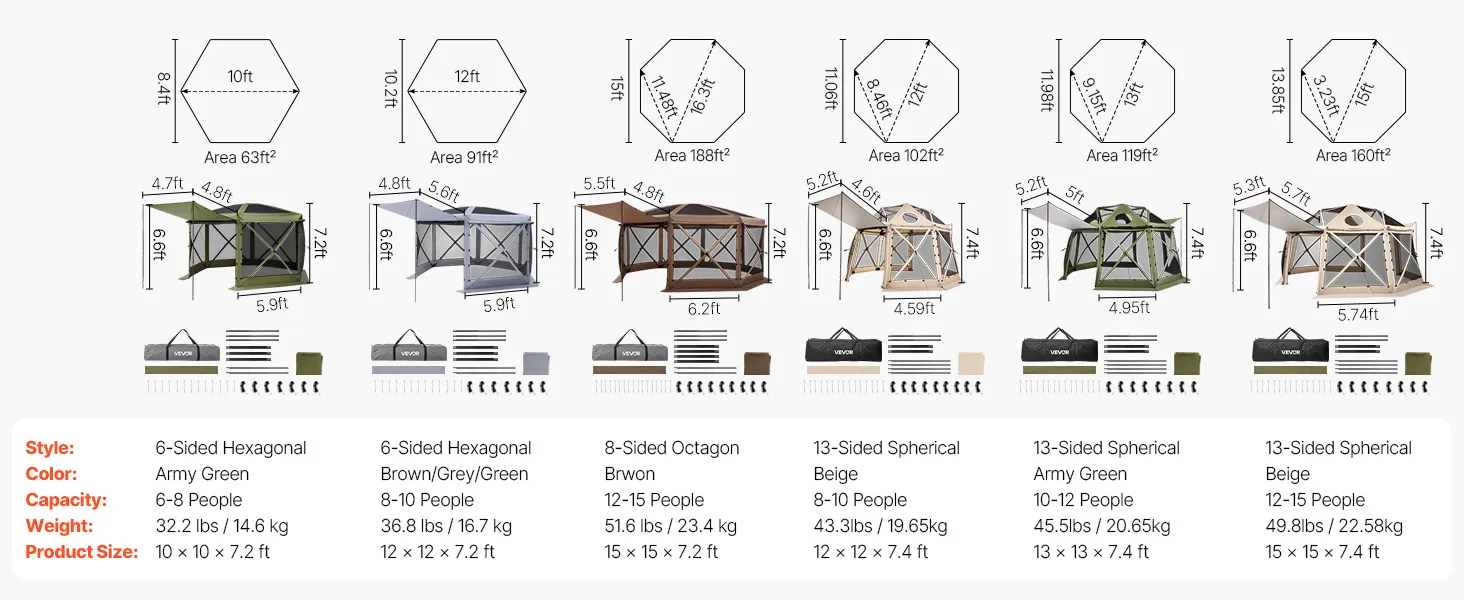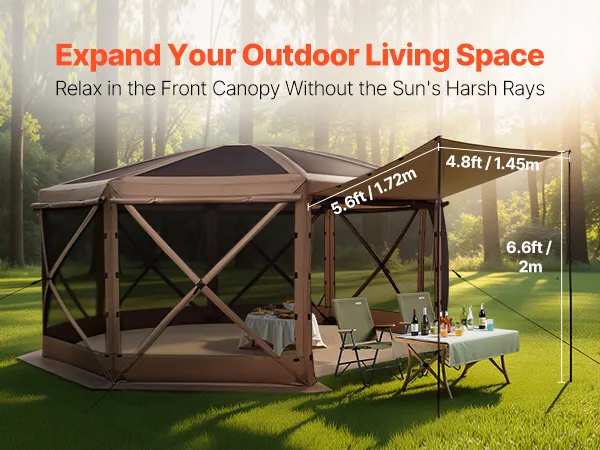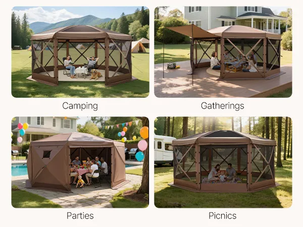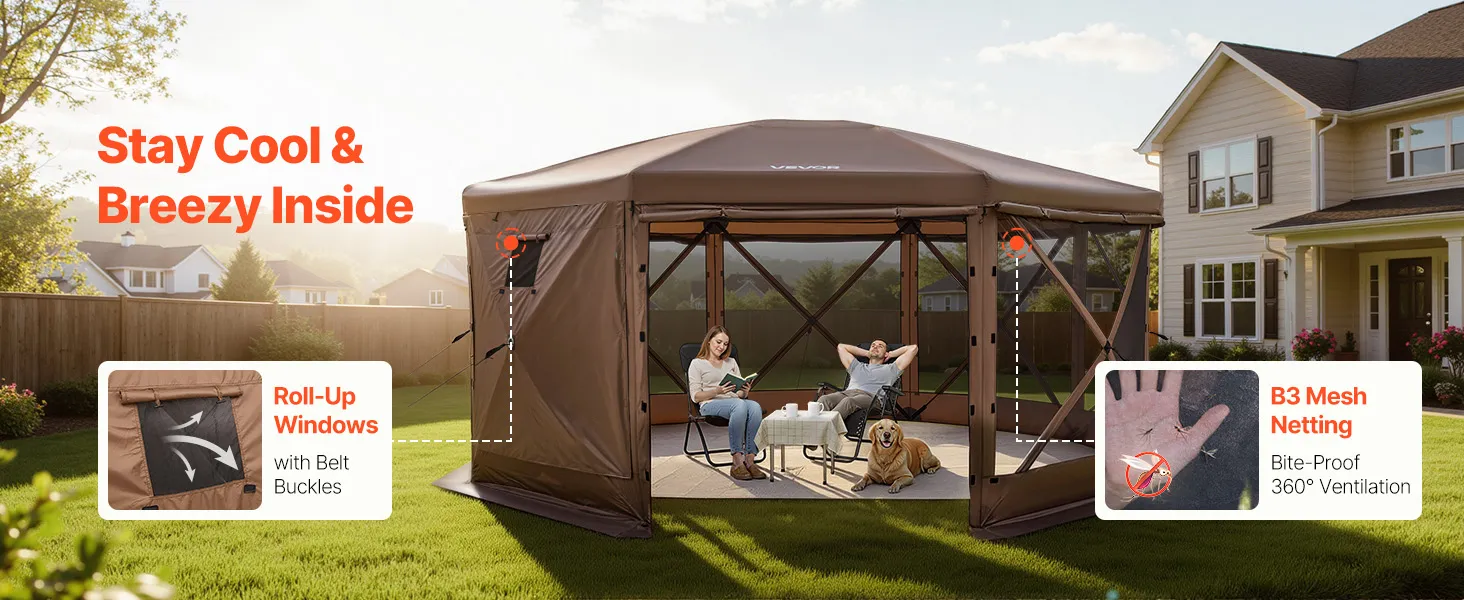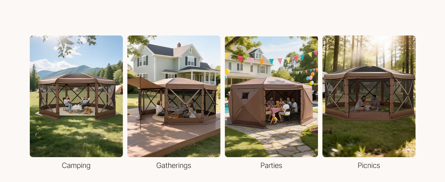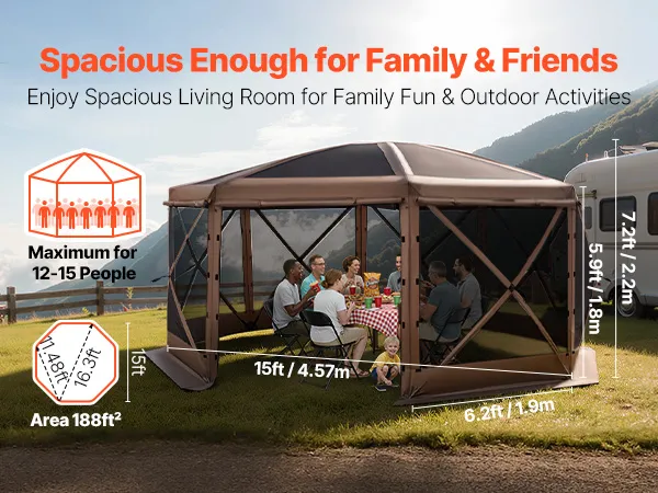The large gazebo screen tent offers spacious activity area and sunshade for family and friend gatherings. 12x12 ft size accommodates 8–10 people. 7.2 ft high canopy allows comfortable standing and movement.