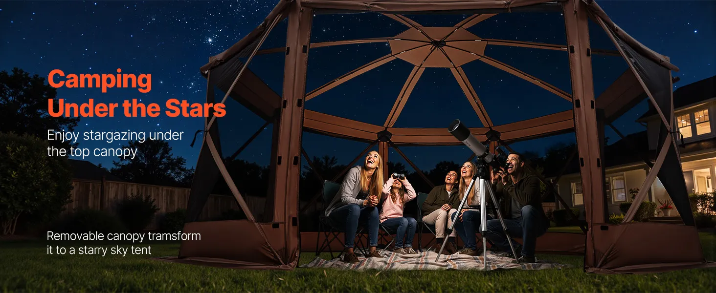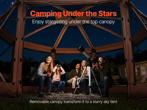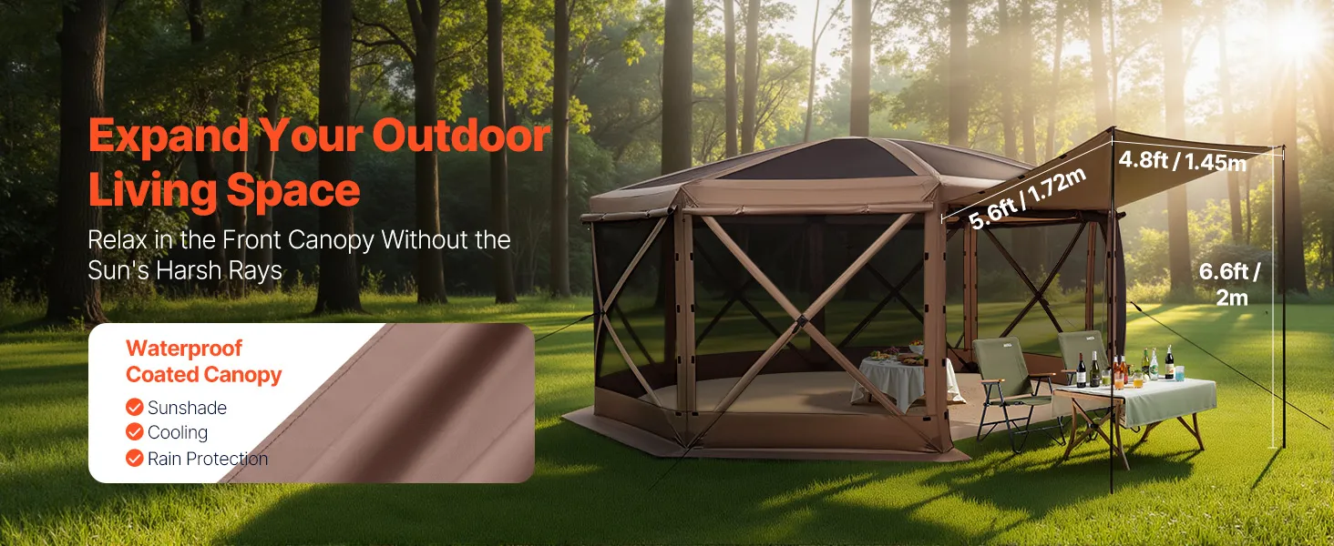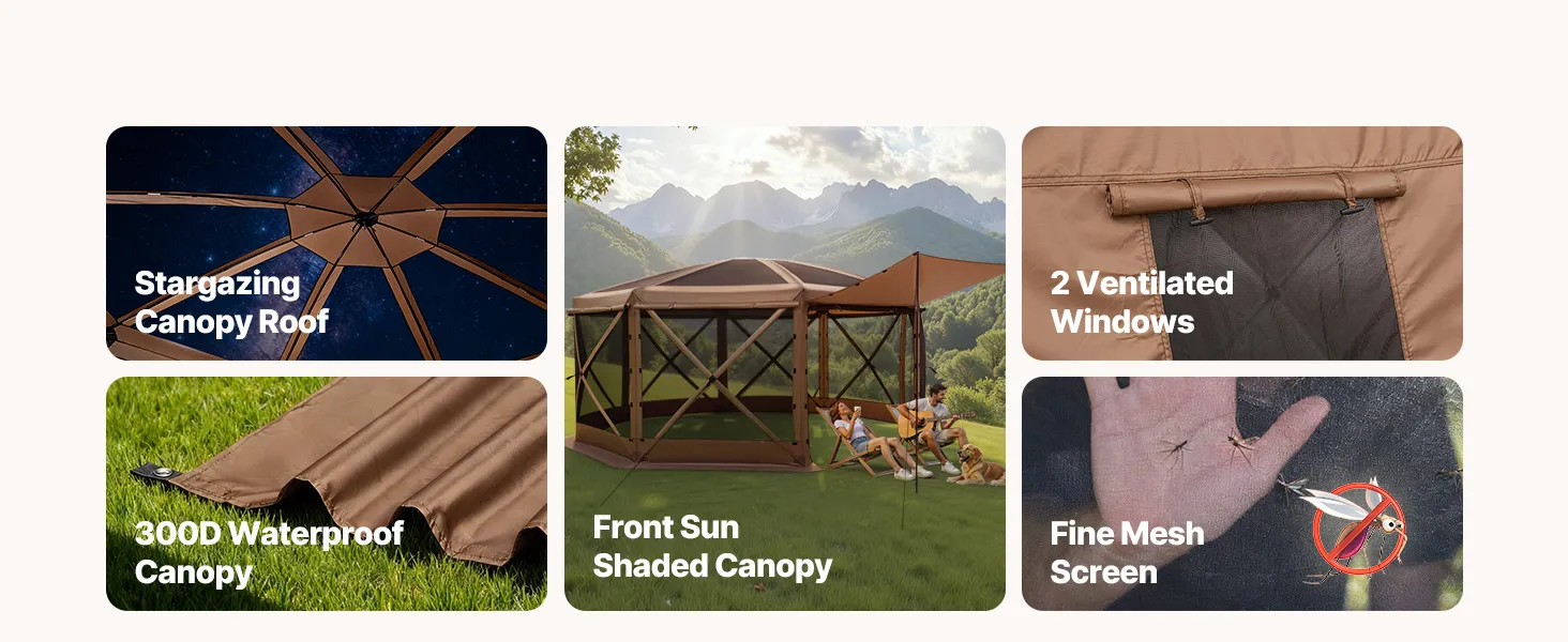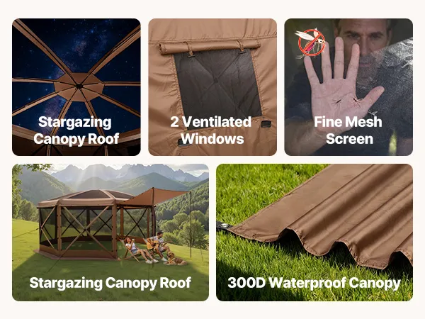 3-in-1 Outdoor Living Space: This camping gazebo tent features convertible door panels double as upgraded sunshade canopies. Durable 300D Oxford canopy with UV50+ protection shields from sunlight, while PU coating keeps rain out. Mesh "starry sky" roof offers an open view for stargazing fun