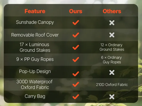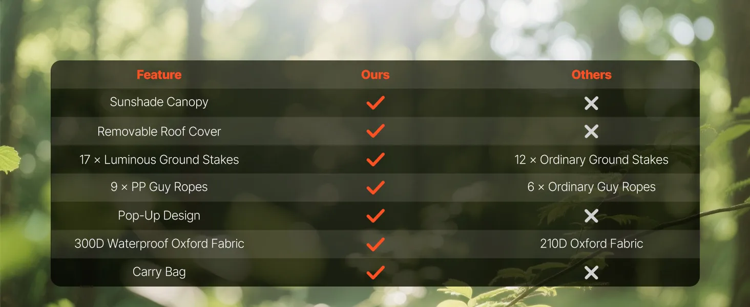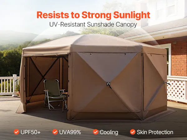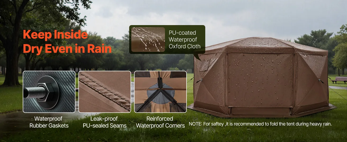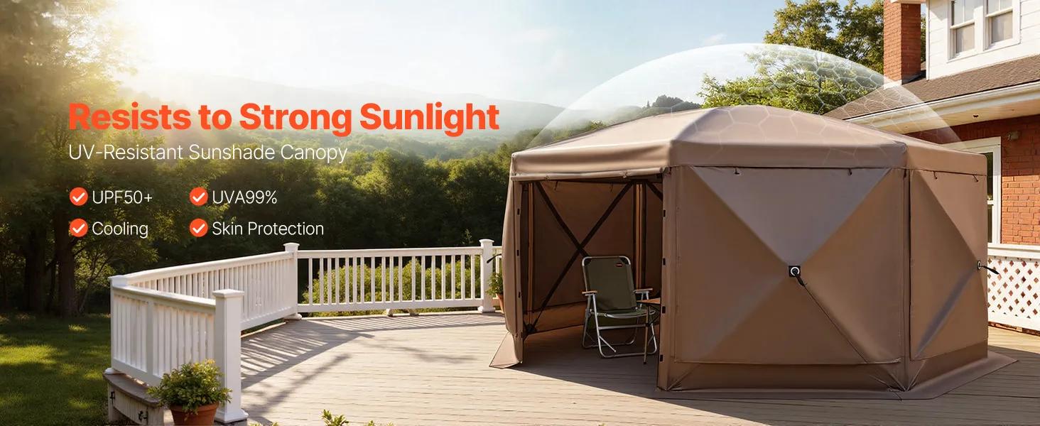 3-in-1 Outdoor Living Space: This camping gazebo tent features convertible door panels double as upgraded sunshade canopies. Durable 300D Oxford canopy with UV50+ protection shields from sunlight, while PU coating keeps rain out. Mesh "starry sky" roof offers an open view for stargazing fun