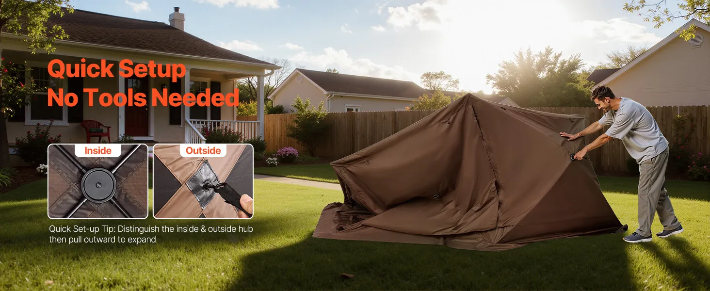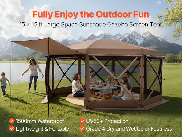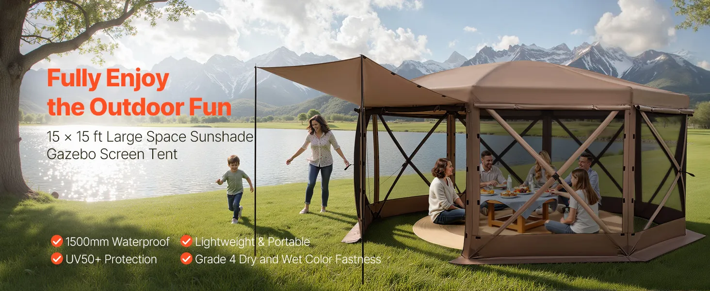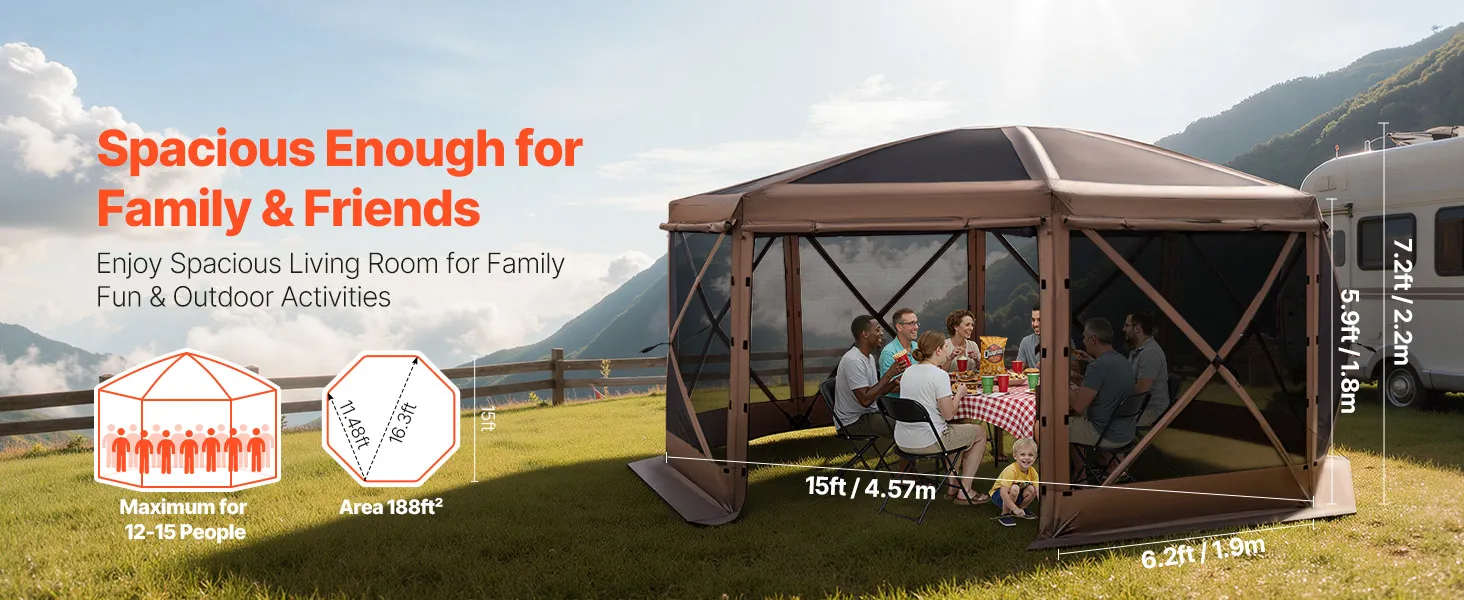 Spacious Room for 15 People: This 15x15 ft pop-up gazebo screen tent comfortably fits 10 seated with furniture, accommodates up to 12-15 people for activities. 7.2 ft high canopy allows easy movement inside. Zippered and tie-back door panels ensure easy entry and exit. Ideal for family gatherings, parties, and camping