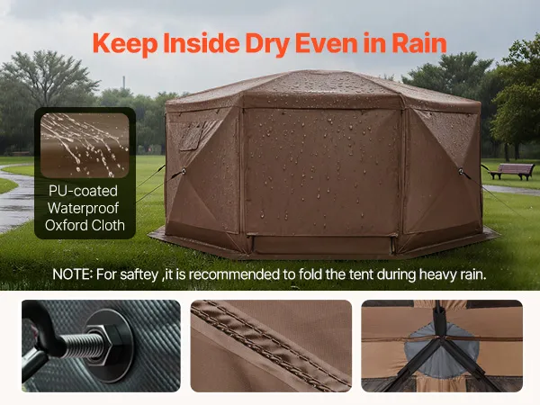 Wind-Resistant Structure: High-strength fiberglass poles and eight reinforced roll-up wind panels enhance stability and privacy. Side loop-and-loop closures prevent panels from flapping in the wind. The pop up canopy includes multiple ground stakes and guy ropes for secure outdoor setup. (Tip: Disassemble during heavy rain or storms for security.)