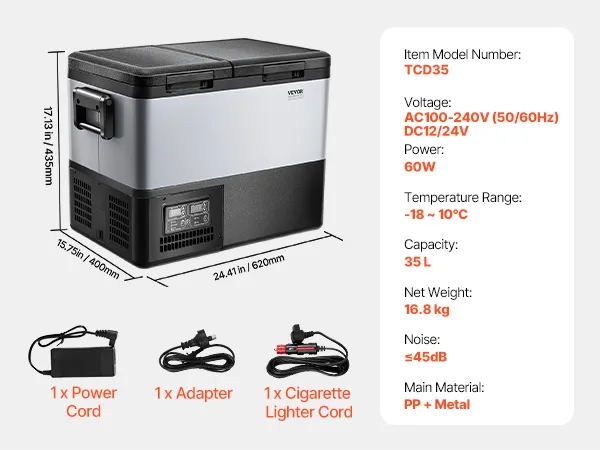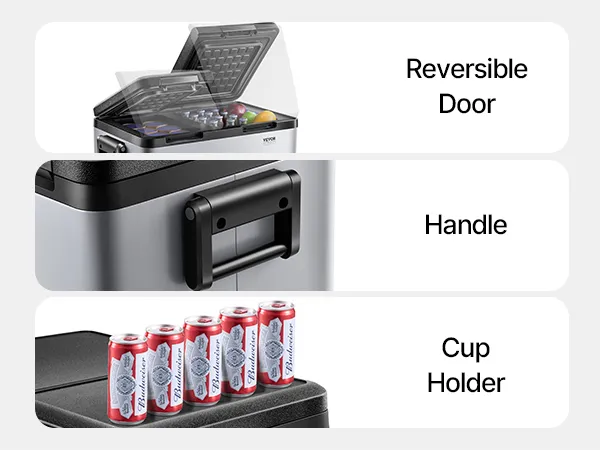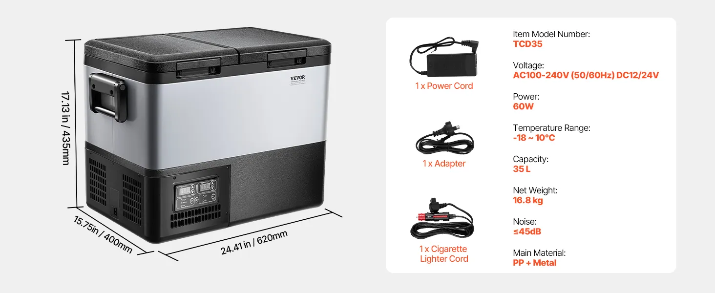 35L Car Refrigerator: This 35L dual-zone portable refrigerator freezer (left compartment 9L, right compartment 26L) can hold 48 cans of 330ml cola or 26 bottles of 550ml water or 12 bottles of 750ml red wine. It is perfect for storing seafood, snacks, meat, and drinks, meeting the needs of short trips like travel, boating, and camping.