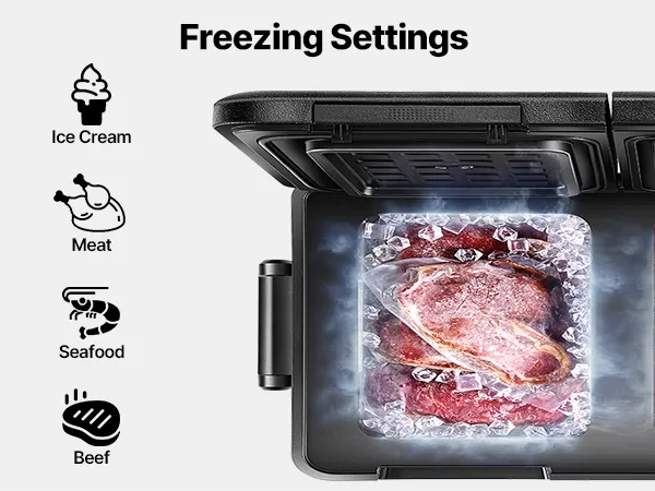 -18℃ ~ 10℃ Dual Temperature Control: The car refrigerator offers an expanded temperature range of -18℃ to 10℃, with both freezing (-18℃ to 0℃) and refrigeration (0℃ to 10℃) functions. The dual-zone, dual-temperature design allows you to freeze and refrigerate simultaneously. You can adjust the temperature for each zone to meet your food storage needs, ensuring food preservation and supply during your trip.