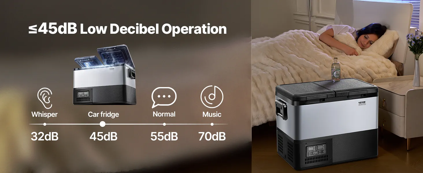 Operates at ≤45 decibels, and the compressor ensures optimal performance even when tilted up to 45 degrees.