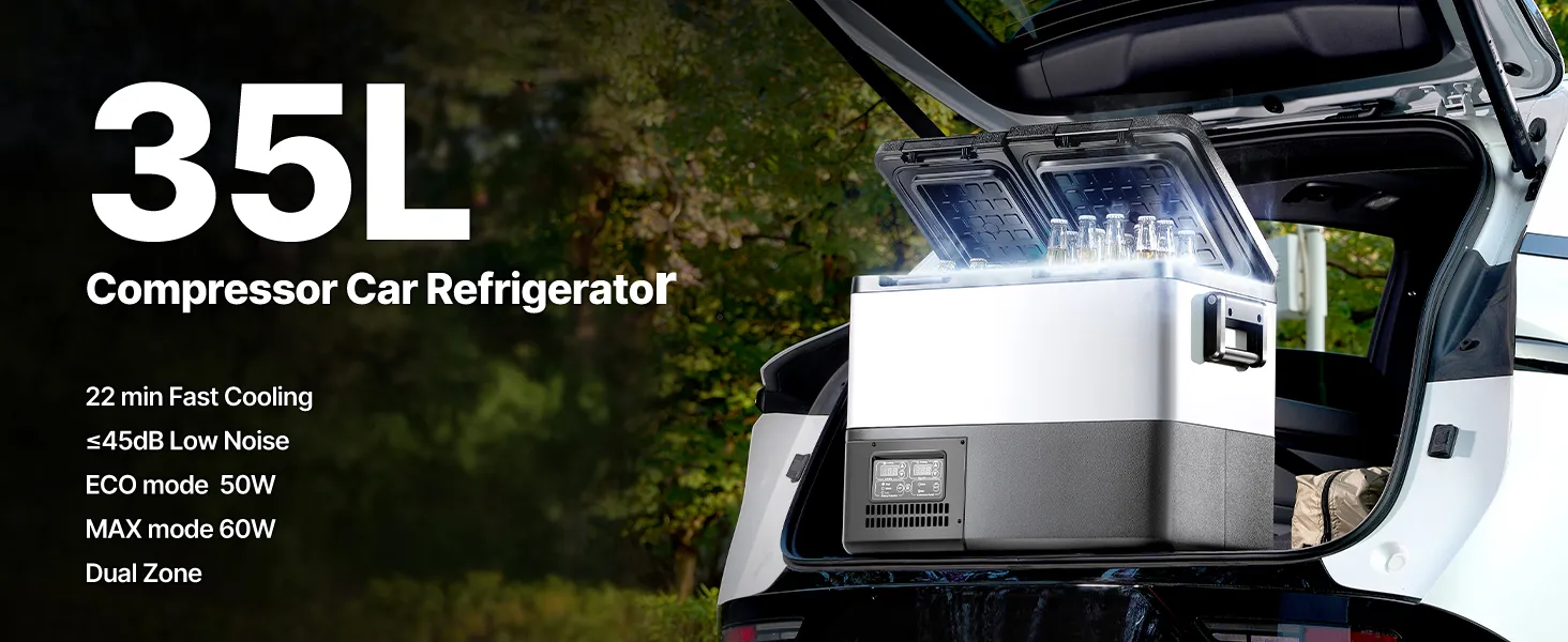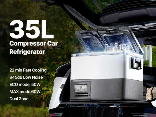 35L car refrigerator with upgraded compressor for rapid cooling within 22 minutes at an ambient temperature of 32°C, capable of storing at both high and low temperatures, ideal for short trips.