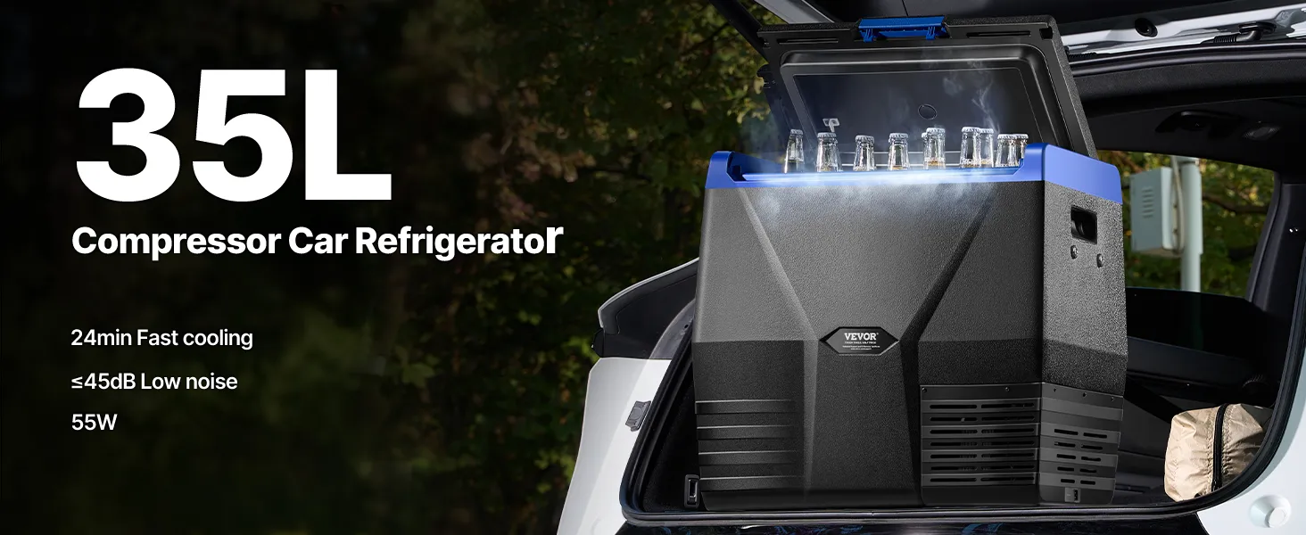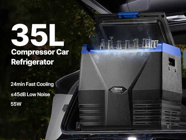 35L car refrigerator with upgraded compressor for rapid cooling within 24 minutes at an ambient temperature of 32°C, capable of storing at both high and low temperatures, ideal for short trips.