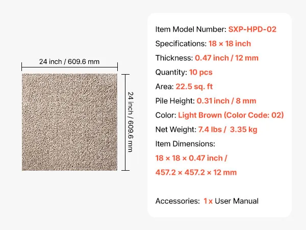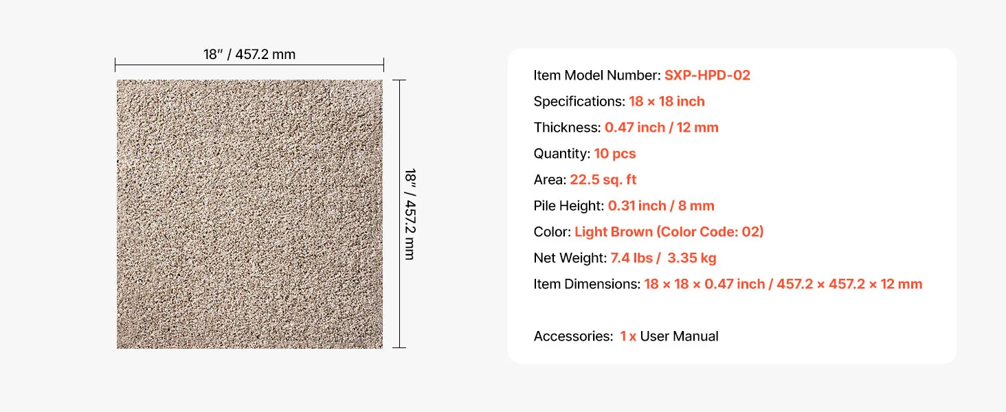 Carpet Tiles Set: This full set includes 10 carpet tiles, each measuring 18x18 inch. When assembled, the carpet square configuration covers 22.5 sq.ft. The modular design makes installation quick,even one person can complete it effortlessly