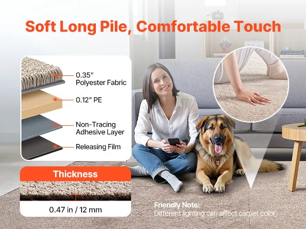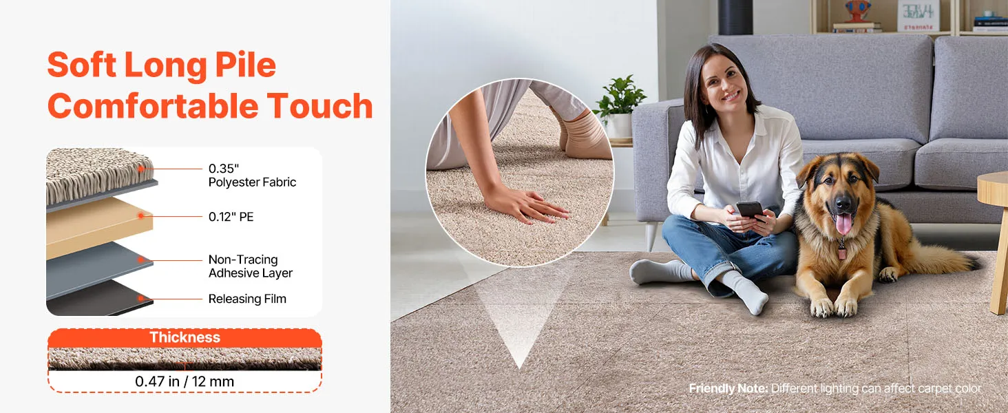 Soft & Comfortable: Each peel and stick carpet tile features a multi-layer construction. The 0.35 in thick plush surface paired with a 0.12 in high-density memory foam pad offers a soft, cushioned feel underfoot