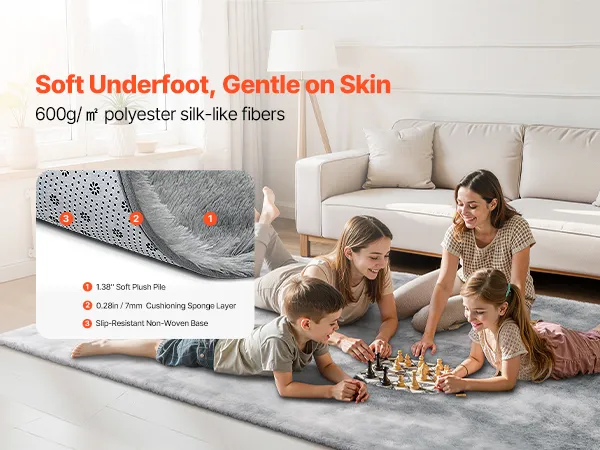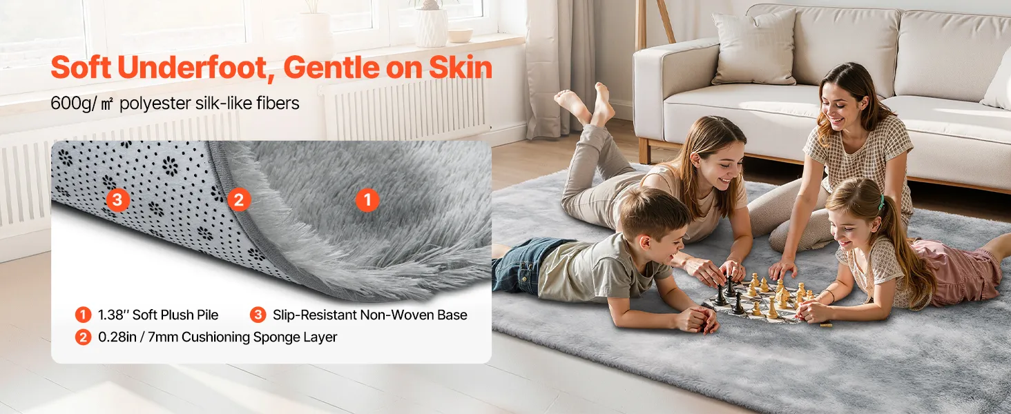 This shag area rug features a soft long-fiber surface with a cushioned sponge middle, giving you a gentle feel even when walking barefoot. The non-woven backing with dotted grip keeps it steady on the floor, ensuring warmth and comfort from bedrooms to living rooms.