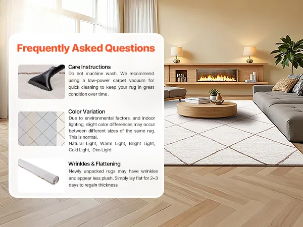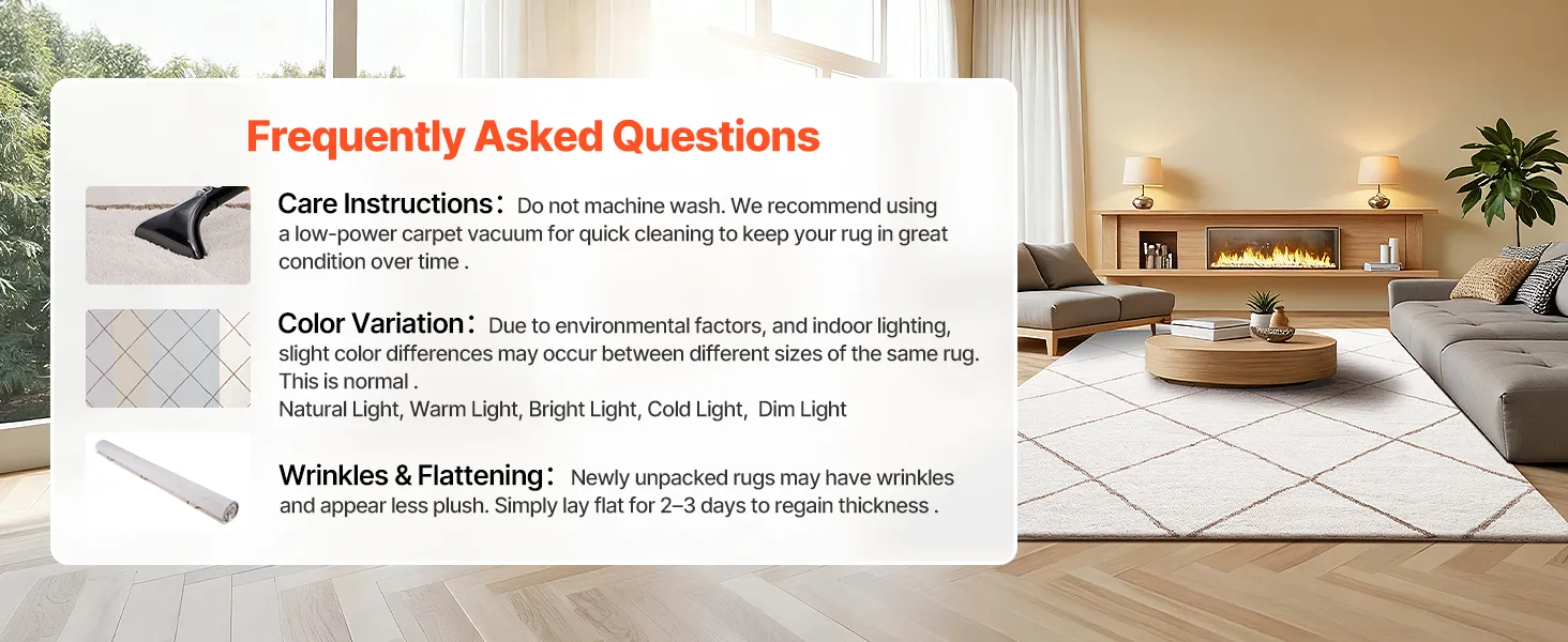 Our soft fluffy shaggy bedside rug should not be washed; we recommend cleaning with a low-power vacuum made for carpets. Colors may look slightly different due to lighting or screen resolution. After unrolling, leave flat for 2-3 days to restore full fluffiness.
