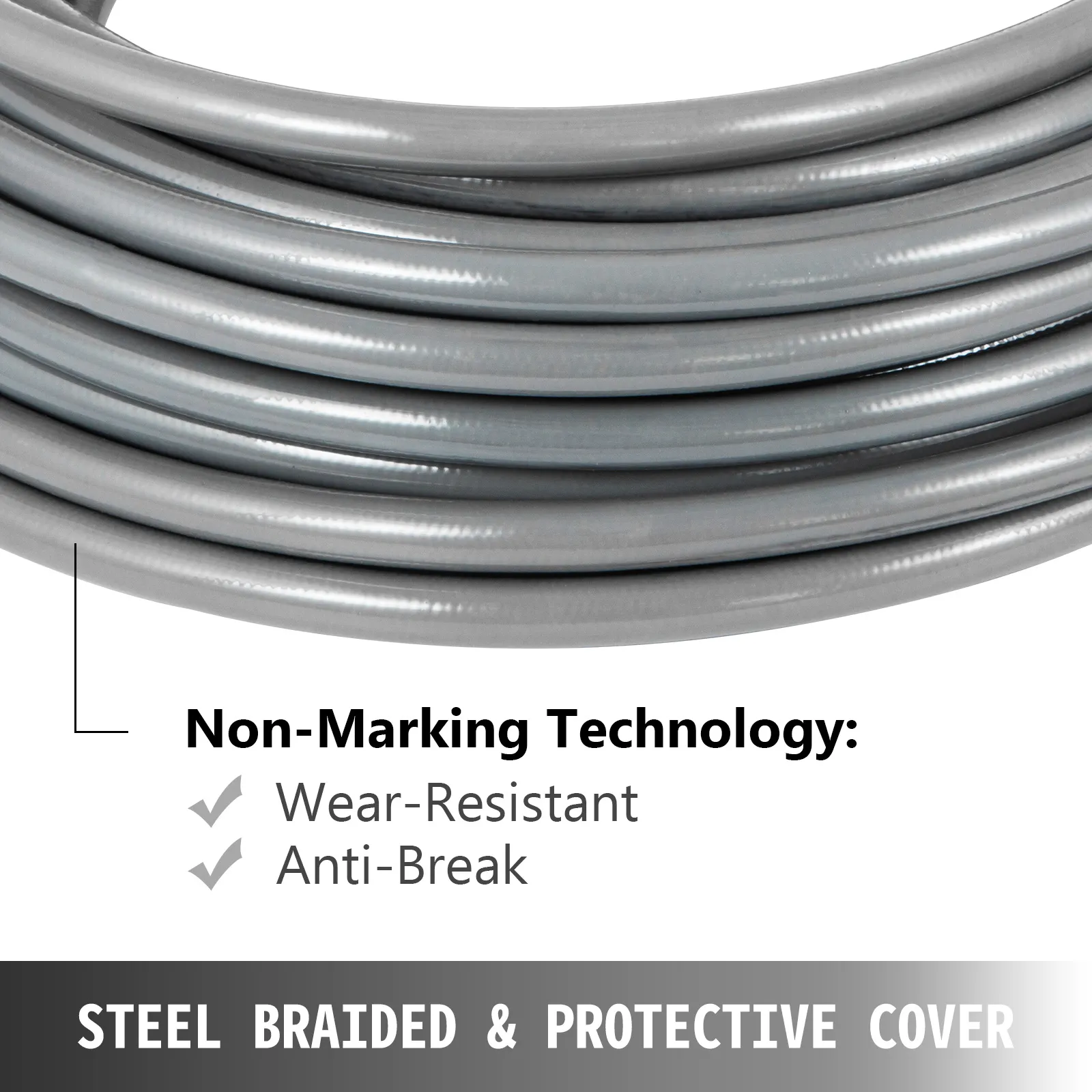 Constructed from braided steel over polyester, and it is protected by outer polyurethane cover. More wear-resistant than rubber ones.