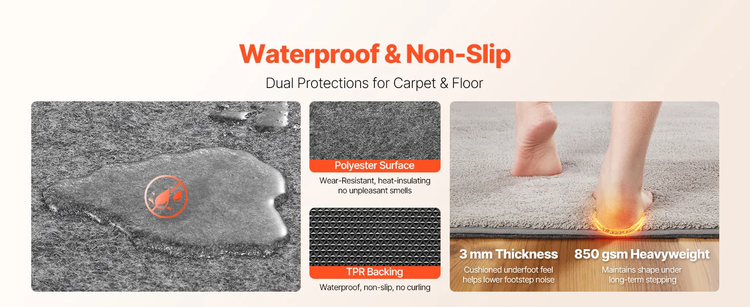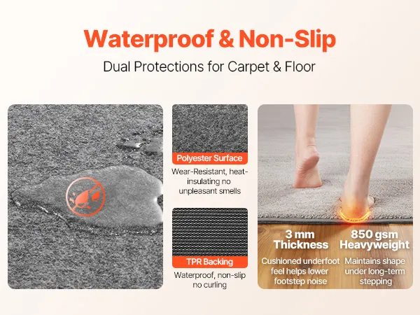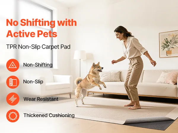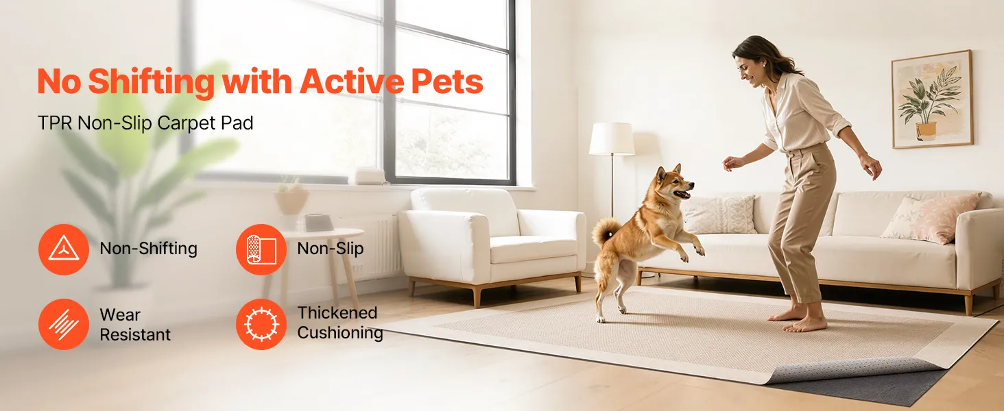 Waterproof & Non-Slip: Featuring a polyester surface with TPR backing, plus included rubber pads, this carpet padding reduces shifting. It minimizes carpet movement from pet zoomies, daily walking, or yoga. TPR backing is waterproof and leakproof