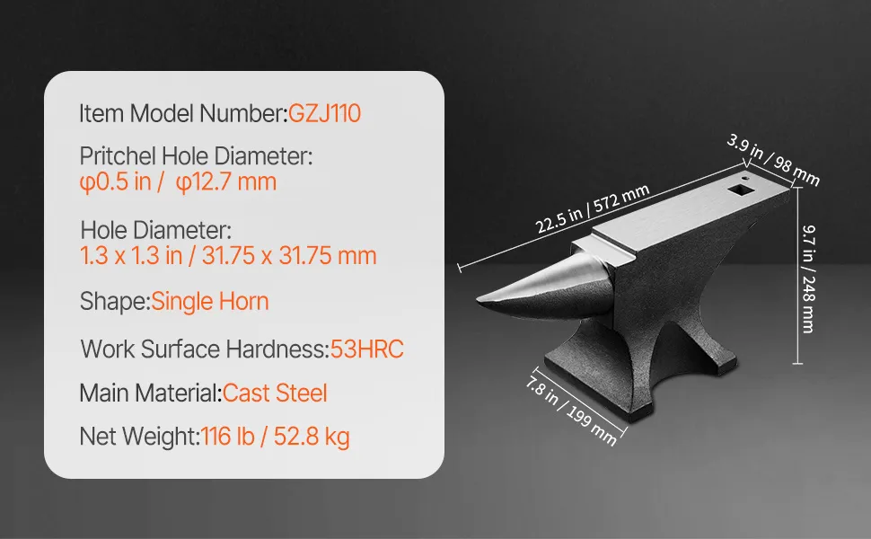 Ideal for Professional Blacksmiths: Weighing 110 lbs, with a working surface of 22.5 x 3.9 in / 572 x 98 mm, this blacksmith anvil is ideal for blacksmithing tasks like riveting, flattening, forging, and shaping. It's also an excellent choice for hobbyists or DIY enthusiasts.