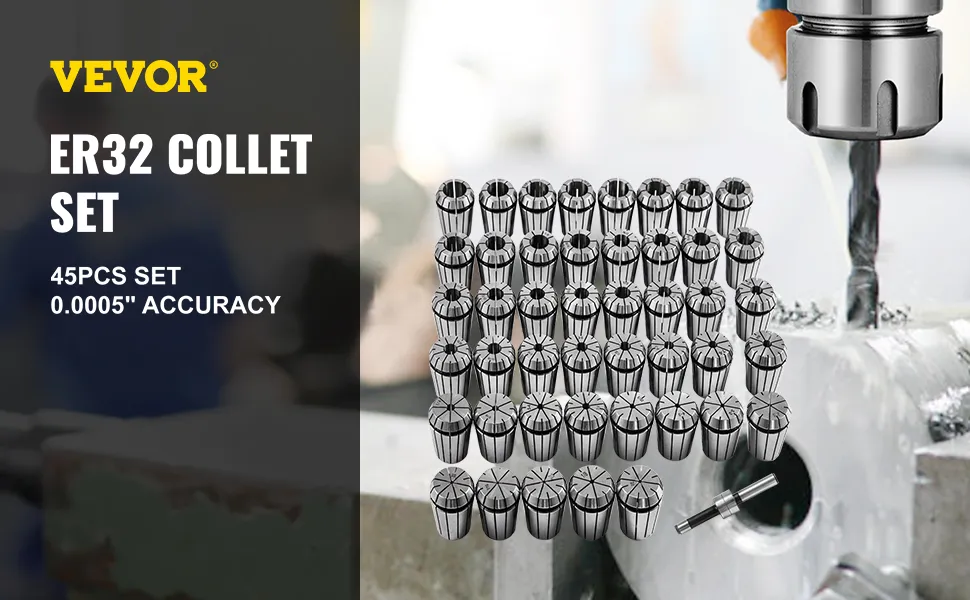 Our ER32 collet set is constructed of hardened, precision-ground high-grade 45# steel for durability, with a rust-resistant finish.