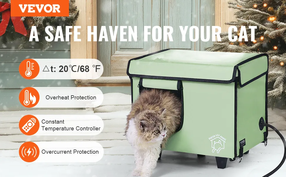 VEVOR Elevated Heated Cat House, Cuboid Kitty Shelter with Adjustable Temperature and Timer, 900D Oxford Cloth Foldable Cat Shelter with Heated Pad for Winter to Stay Warm and Cozy, Green (Small)