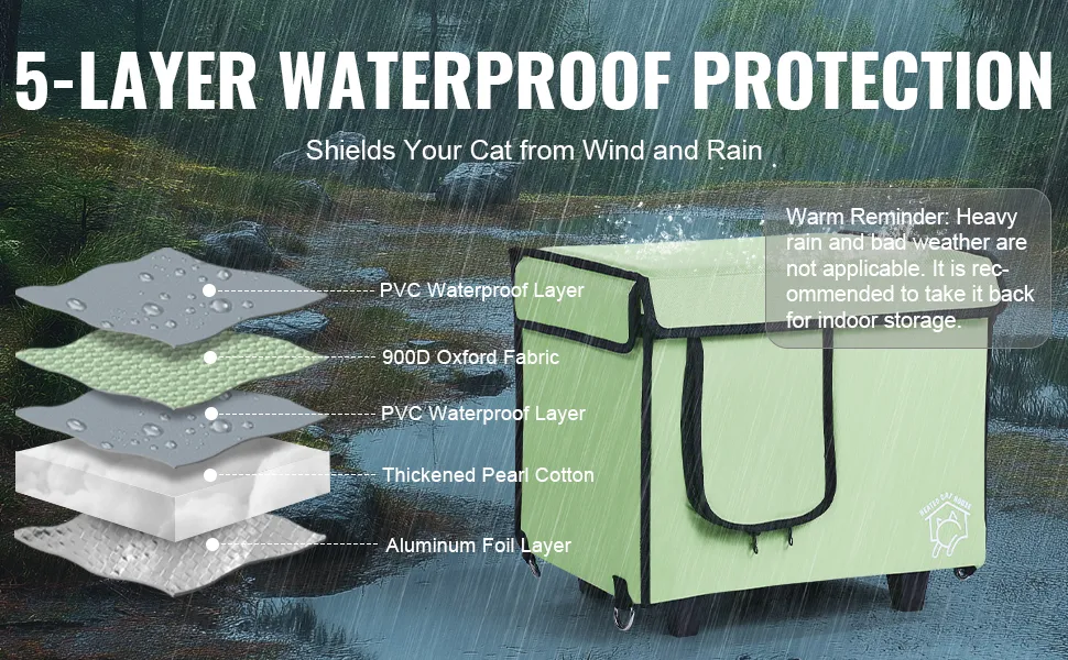 Designed for changing weather, this cat house offers great protection with 5 layers of materials. The outer layer consists of a waterproof PVC layer and 900D Oxford cloth to prevent rain penetration, while the inner layers of thick pearl cotton and aluminum foil enhance insulation and lock in heat.
