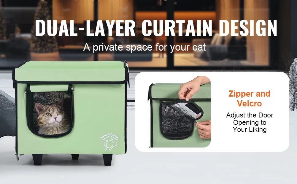 The combination of a zipper and Velcro allows for flexible adjustment of the entrance in this cat shelter with a privacy door, giving your cat privacy. The transparent PVC curtain enables your cat to observe the outside while blocking cold winds, ensuring warmth and comfort inside the shelter.