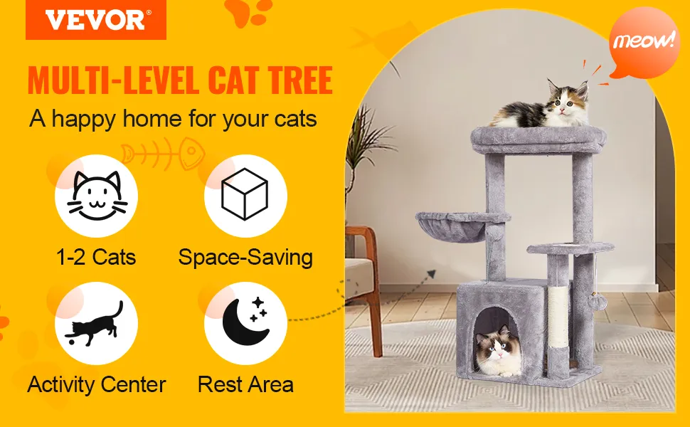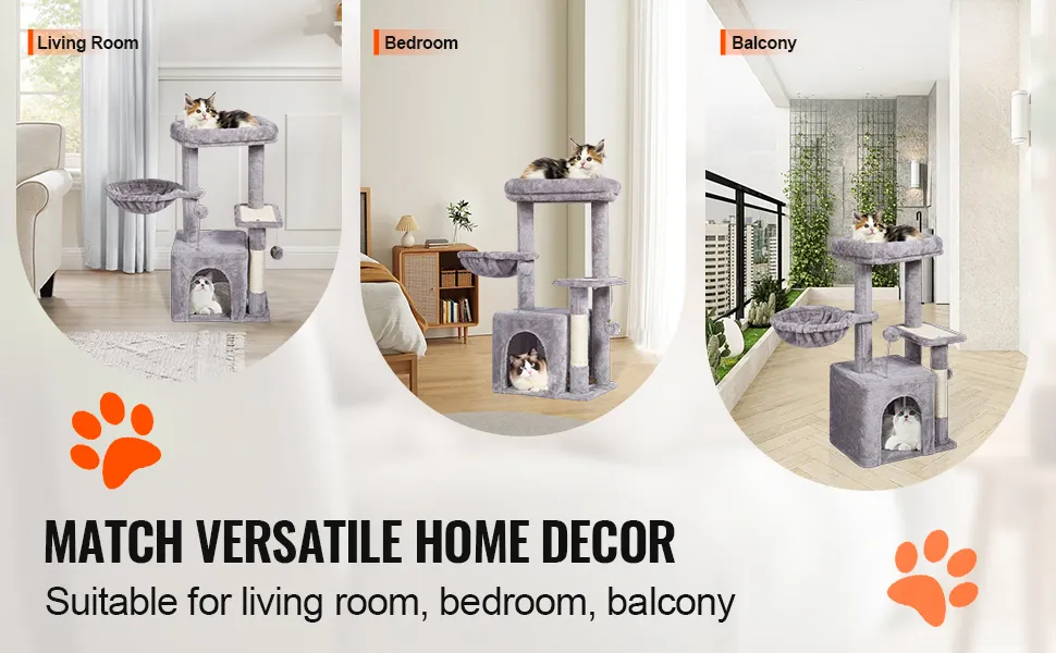 This VEVOR cat tree is perfect for small to medium cats. It offers multiple platforms at various heights for exploration. Every cat can find its ideal space at the top or lower resting area. The design ensures each cat gets a spot they love. This cat tree is suitable for homes with one or two felines. Each platform is strong enough to support active play and rest. The light grey color matches most home décor well, so it’s an attractive addition to any room. With its well-designed structure, this cat tree can enhance any living space too.