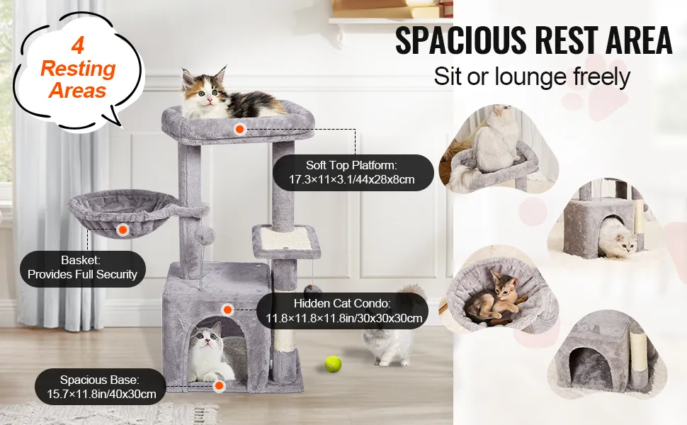 The cat tower has a large cat condo, top perch, and hammock. These provide a secluded and secure resting environment. The soft, plush surfaces are gentle on cats' skin and claws. This ensures a comfortable lounging experience. The cats can curl up in the condo or stretch out on the perches. The hammock provides naps. It caters to different resting preferences. You get a cozy space for cats to relax. The cats will enjoy spending time in this cozy retreat.