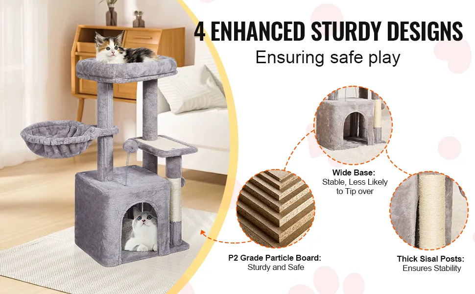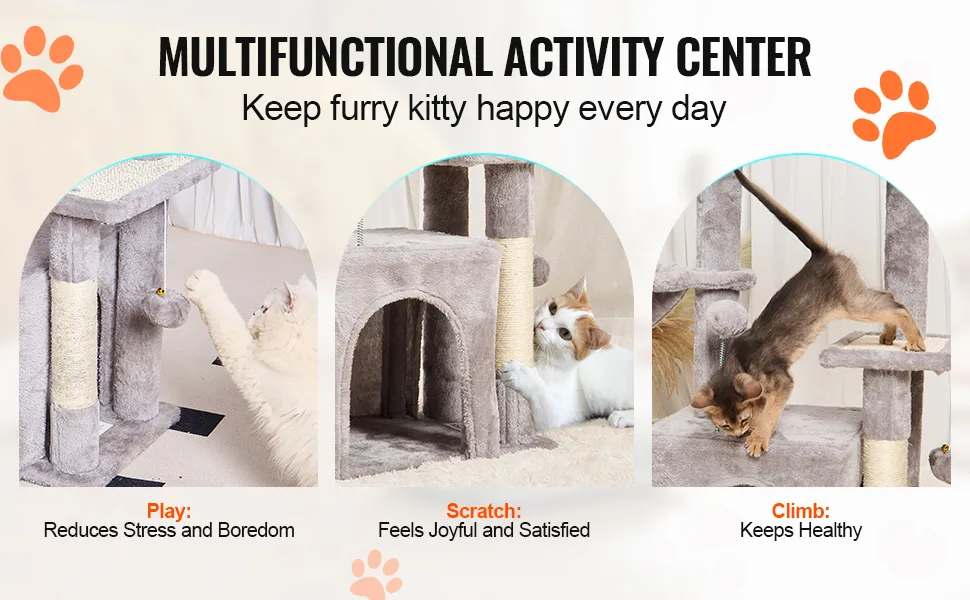 These features attract the attention of cats and stimulate their playfulness. The sisal-wrapped scratching posts allow cats to stretch and exercise. This helps prevent furniture damage and keeps them active. The play features relieve boredom and stress. The cats can sharpen their claws on the sisals. It satisfies natural scratching instincts. Interactive elements keep cats entertained. This cat tree provides both mental and physical stimulation.