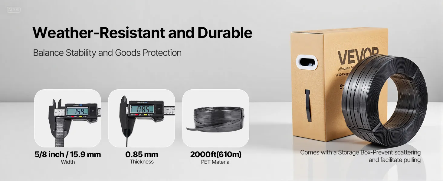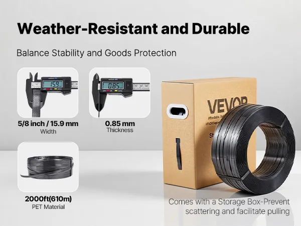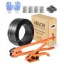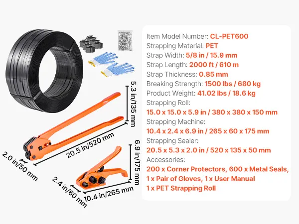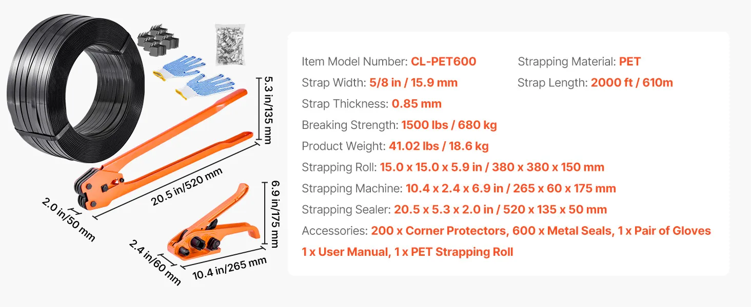 Complete Kit Included: The pallet strapping kit contains 1 roll of 2000 ft / 610 m black PET strapping, 1 strapping tensioner, 1 heavy-duty strapping sealer, 600 metal seals, 200 x corner protectors, and 1 pair of gloves