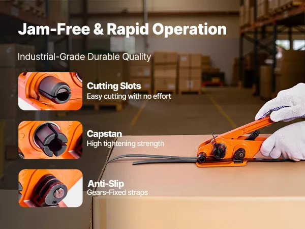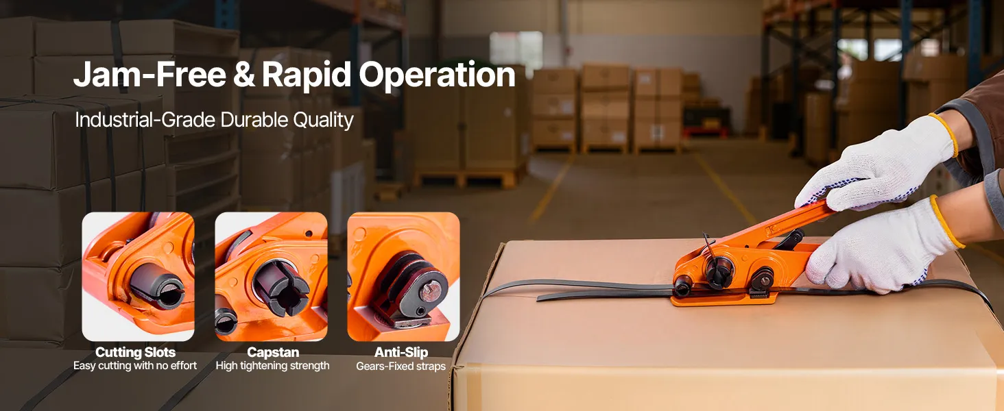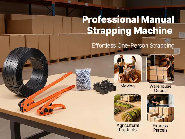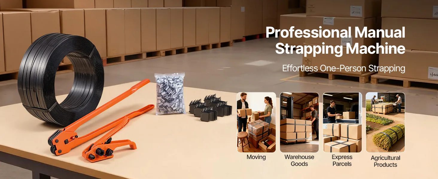 Manual Strapping Sealer: This is a heavy-duty manual banding strapping kit, equipped with an extended handle. It enhances strapping force through labor-saving lever operation and supports 5/8 in / 15.9 mm wide polyester (PET) strapping