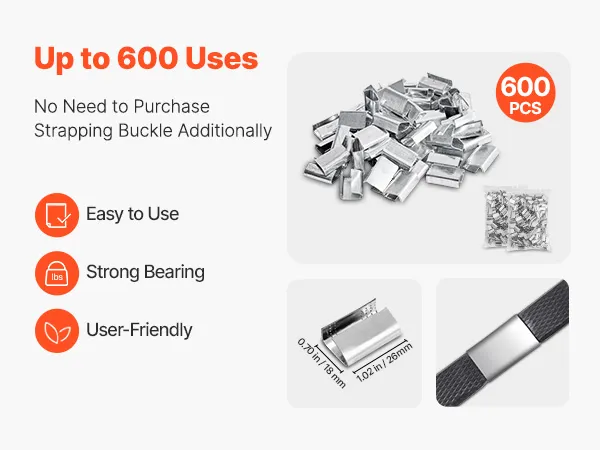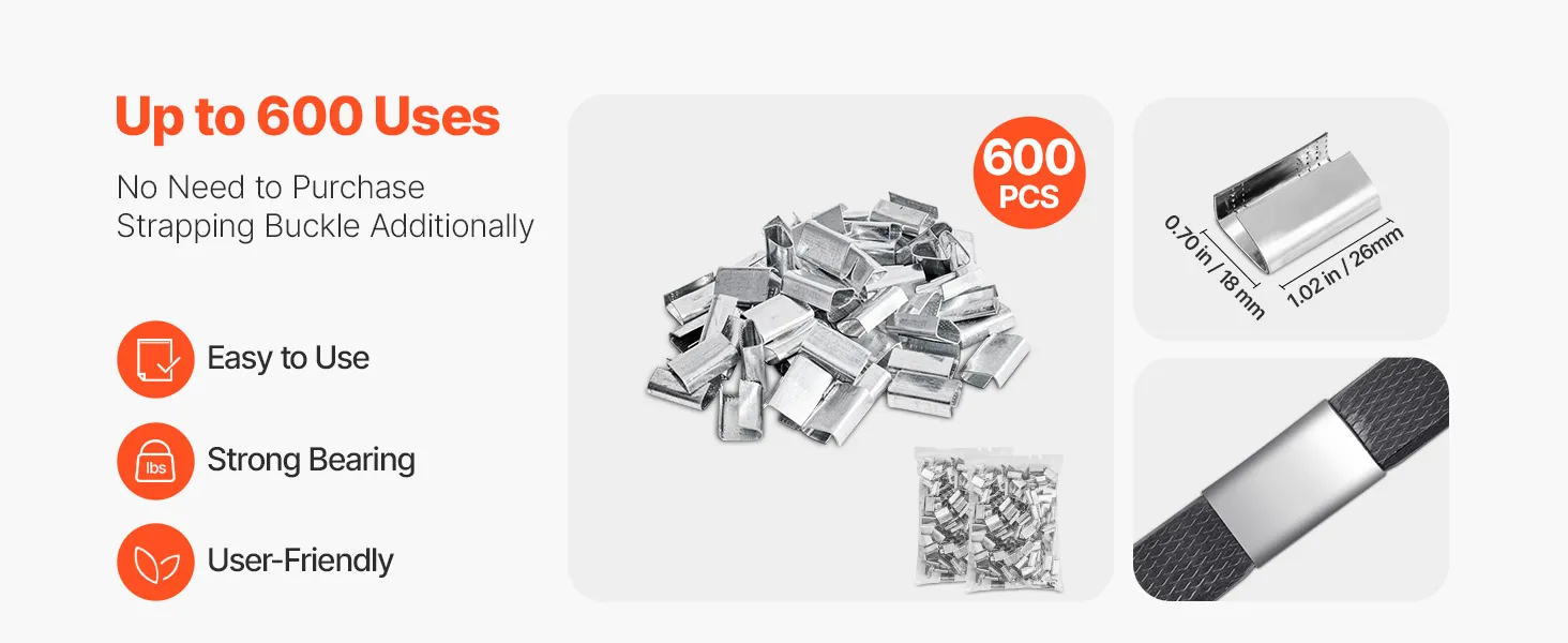 Our strapping kit includes 1 strapping tensioner, 1 heavy-duty strapping sealer, 600 metal seals, 200 x corner protectors, and 1 roll of PET strapping band. The strapping band is 2000 ft / 610 m, providing ample usage. This complete strapping tool set meets all your daily packaging needs!