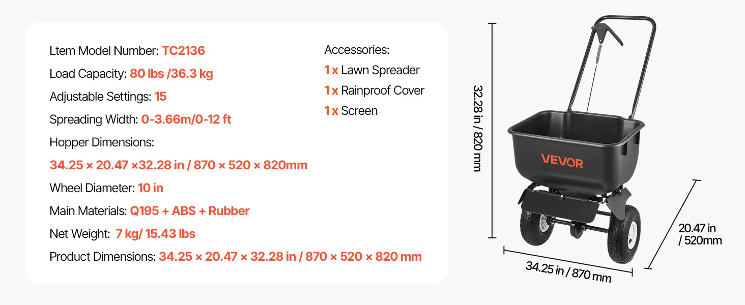 Precise Spreading: The lawn spreader features 12-ft spreading width and 15 adjustable settings that allows precise distribution for grass seeds, fertilizers and ice melt. Multi-directional adjustment ensures no missed spots, while the 80-lb hopper reduces refilling frequency